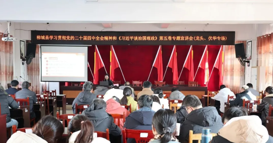 為持續(xù)推動習(xí)近平新時代中國特色社會主義思想走深走實(shí)、入腦入心,引導(dǎo)廣大黨員干部群眾深刻領(lǐng)會黨的二十屆四中全會精神,準(zhǔn)確把握《習(xí)近平談治國理政》第五卷的豐富內(nèi)涵與實(shí)踐要求,2026年1月7日,柳城縣學(xué)習(xí)貫徹黨的二十屆四中全會精神和《習(xí)近平談治國理政》第五卷專題宣講會(龍頭、伏華專場)在龍頭鎮(zhèn)政府大會議室隆重舉行。龍頭鎮(zhèn)全體干部職工、各村委(社區(qū))支書現(xiàn)場聆聽了宣講會。