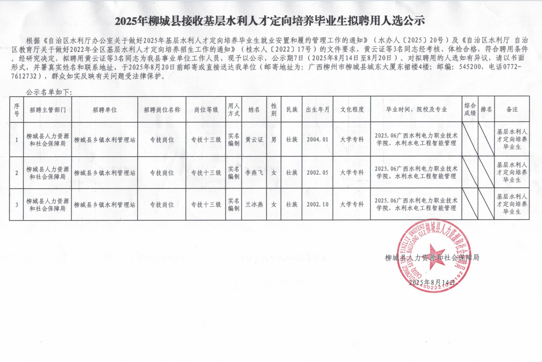 2025年柳城縣接收基層水利人才定向培養(yǎng)畢業(yè)生擬聘用人選公示