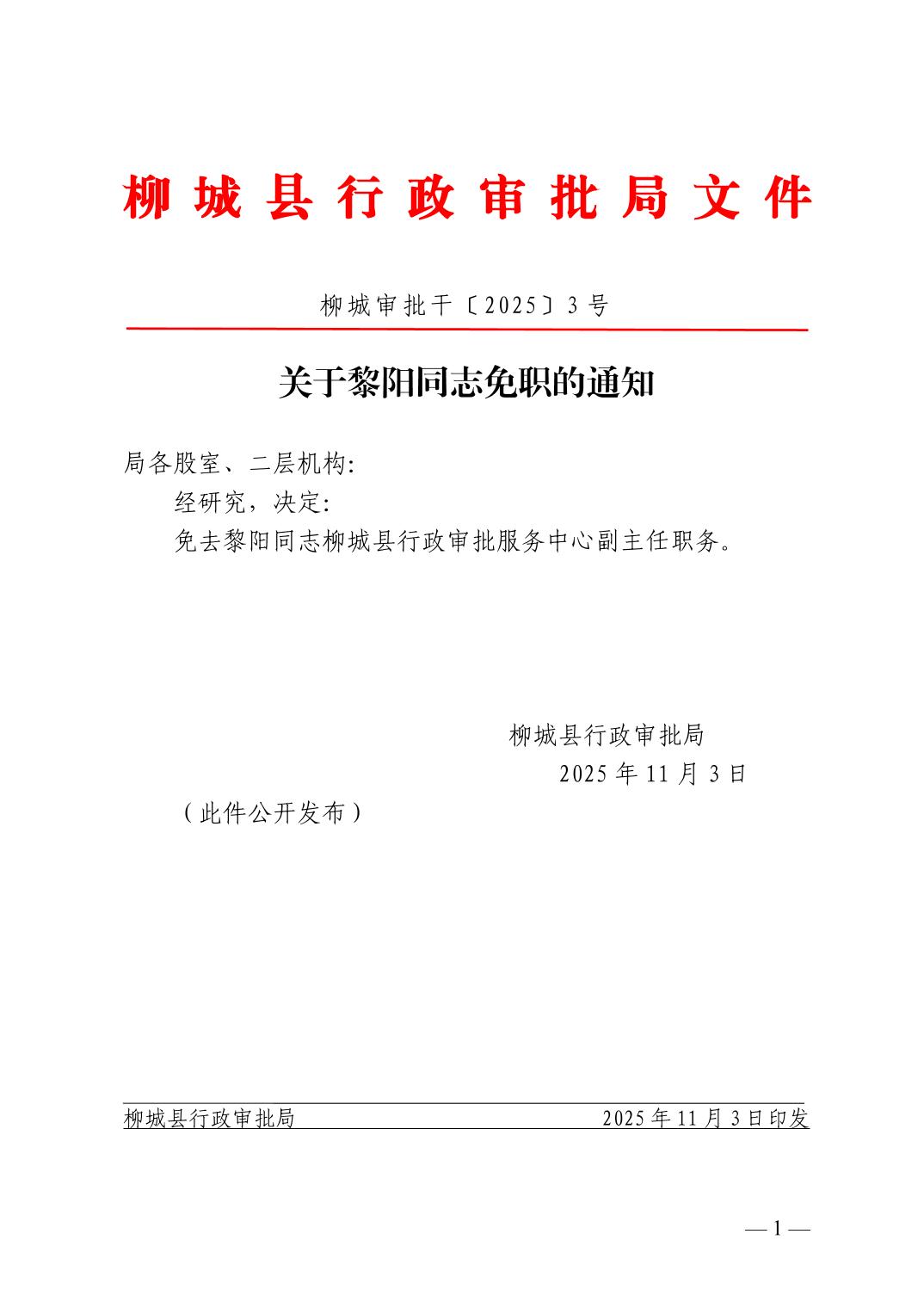 柳城審批干〔2025〕3號(hào)關(guān)于黎陽(yáng)同志免職的通知