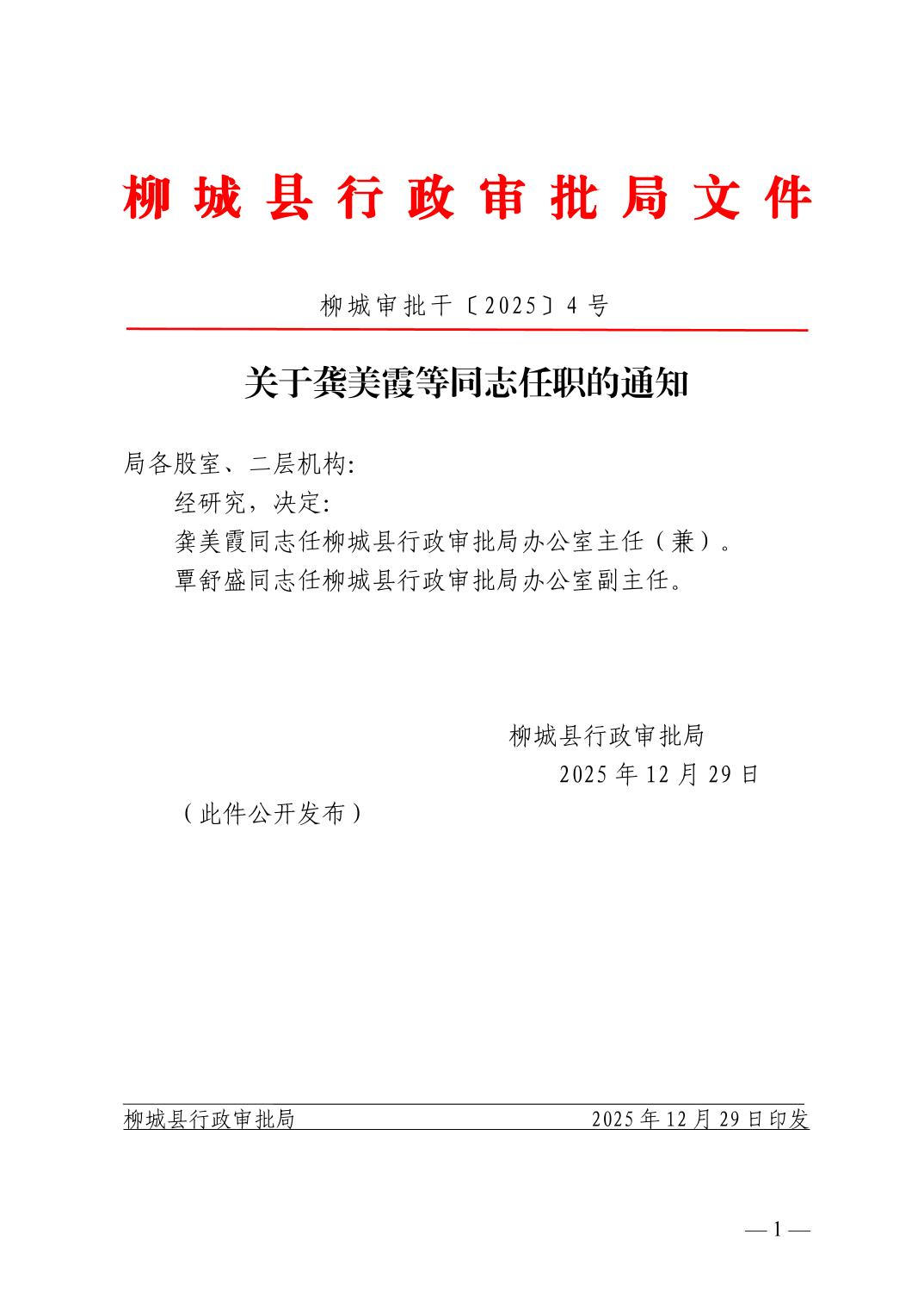 柳城審批干〔2025〕4號關(guān)于龔美霞等同志任職的通知