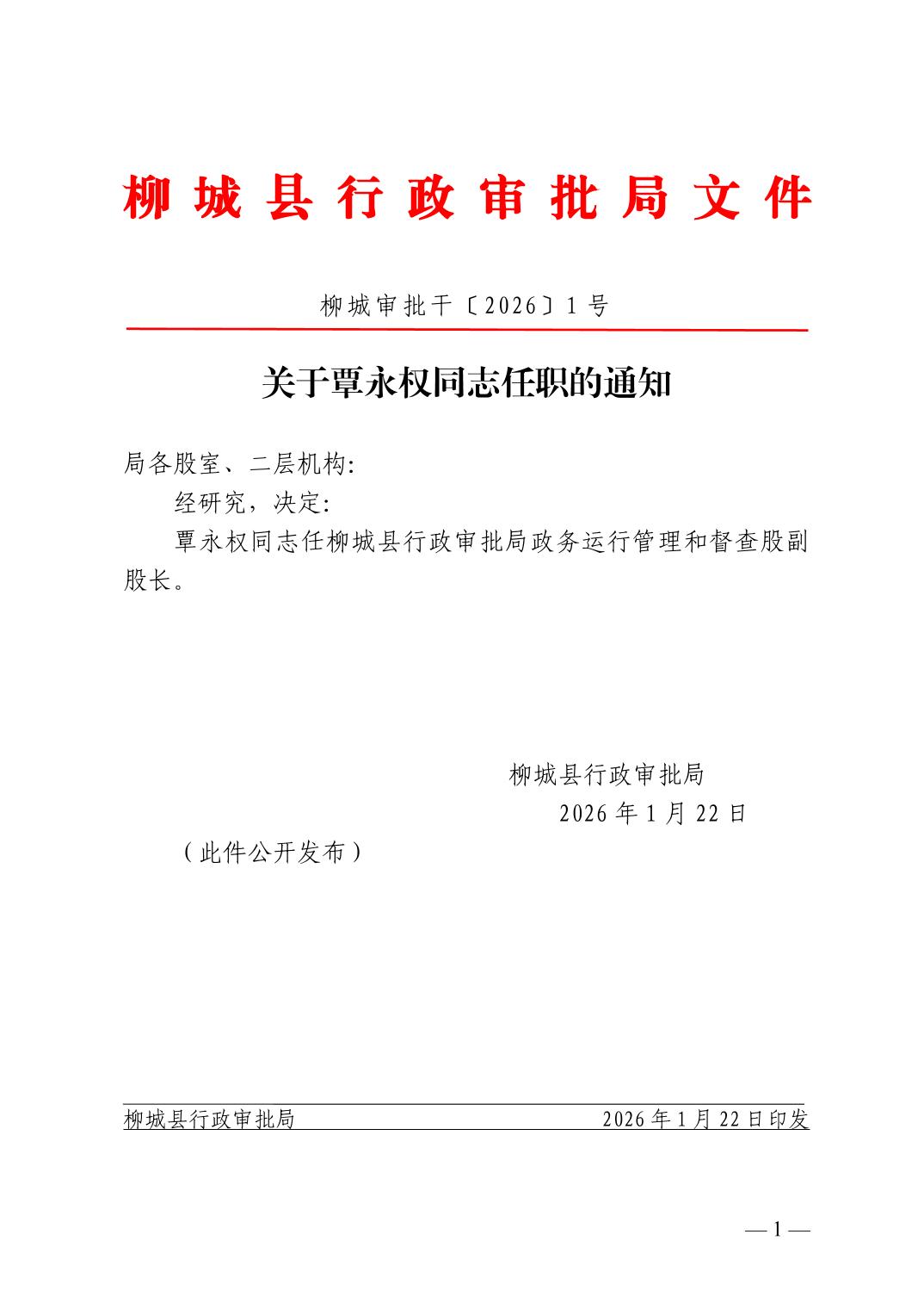 柳城審批干〔2026〕1號(hào)關(guān)于覃永權(quán)同志任職的通知