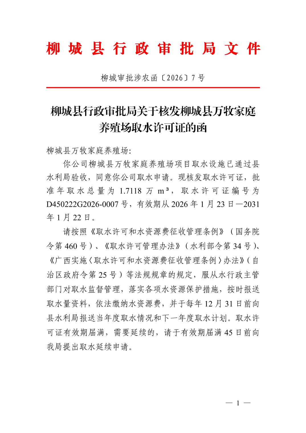 柳城縣行政審批局關(guān)于核發(fā)柳城縣萬(wàn)牧家庭養(yǎng)殖場(chǎng)取水許可證的函