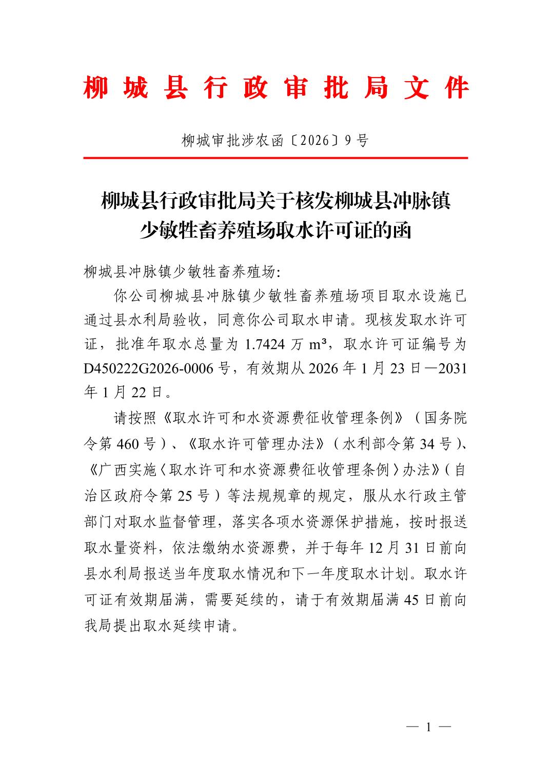 柳城縣行政審批局關于核發(fā)柳城縣沖脈鎮(zhèn)少敏牲畜養(yǎng)殖場取水許可證的函