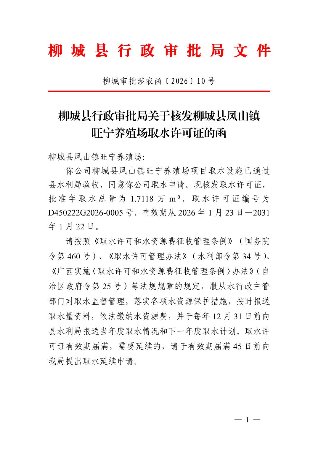柳城縣行政審批局關(guān)于核發(fā)柳城縣鳳山鎮(zhèn)旺寧養(yǎng)殖場(chǎng)取水許可證的函