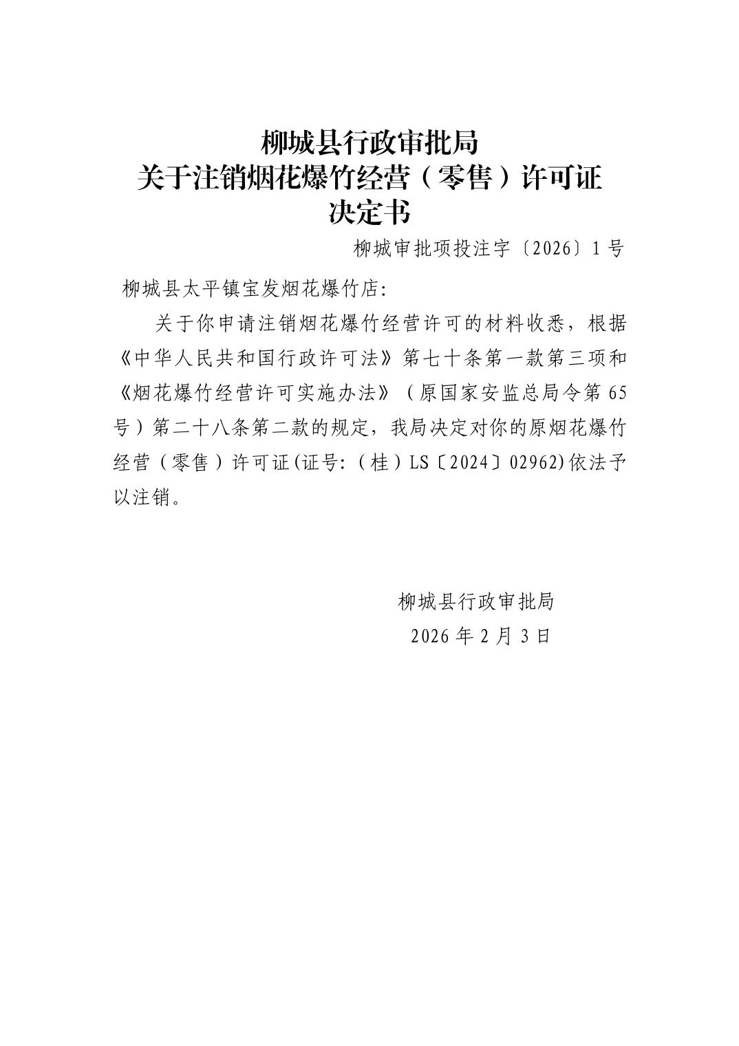 柳城縣行政審批局關(guān)于注銷煙花爆竹經(jīng)營(yíng)(零售)許可證決定書