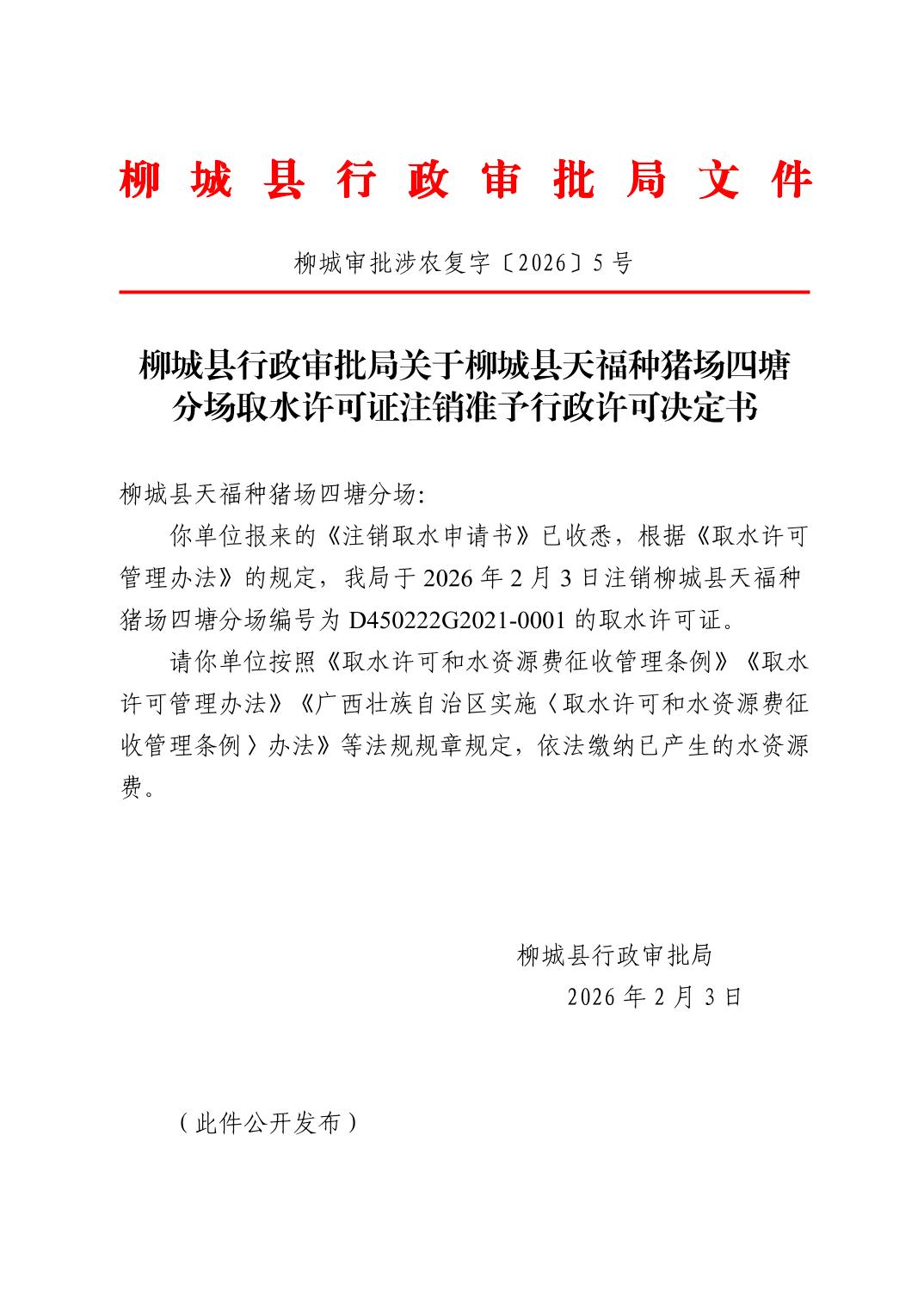 柳城縣行政審批局關(guān)于柳城縣天福種豬場(chǎng)四塘分場(chǎng)取水許可證注銷(xiāo)準(zhǔn)予行政許可決定書(shū)