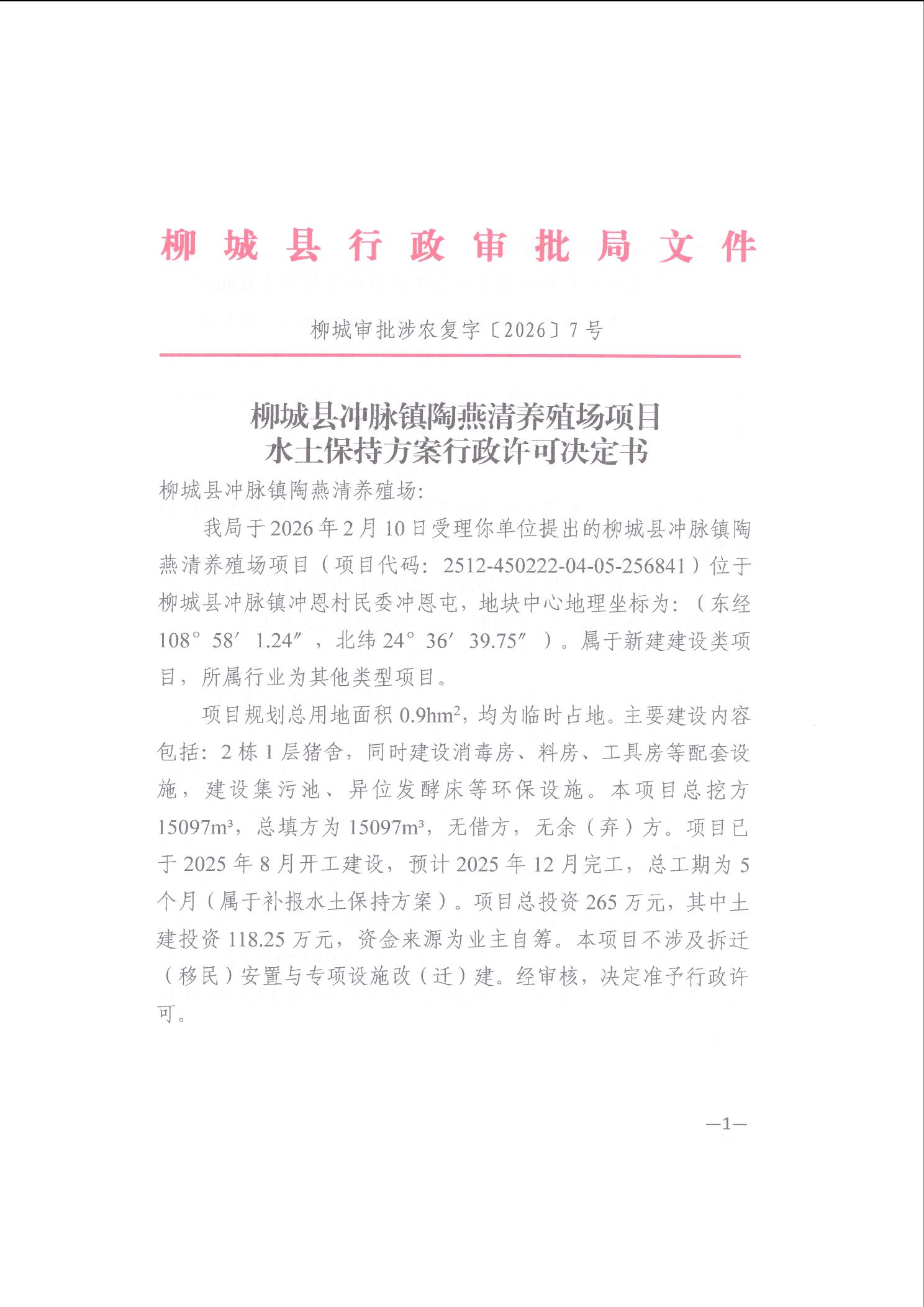 柳城縣沖脈鎮(zhèn)陶燕清養(yǎng)殖項目水土保持方案行政許可決定書