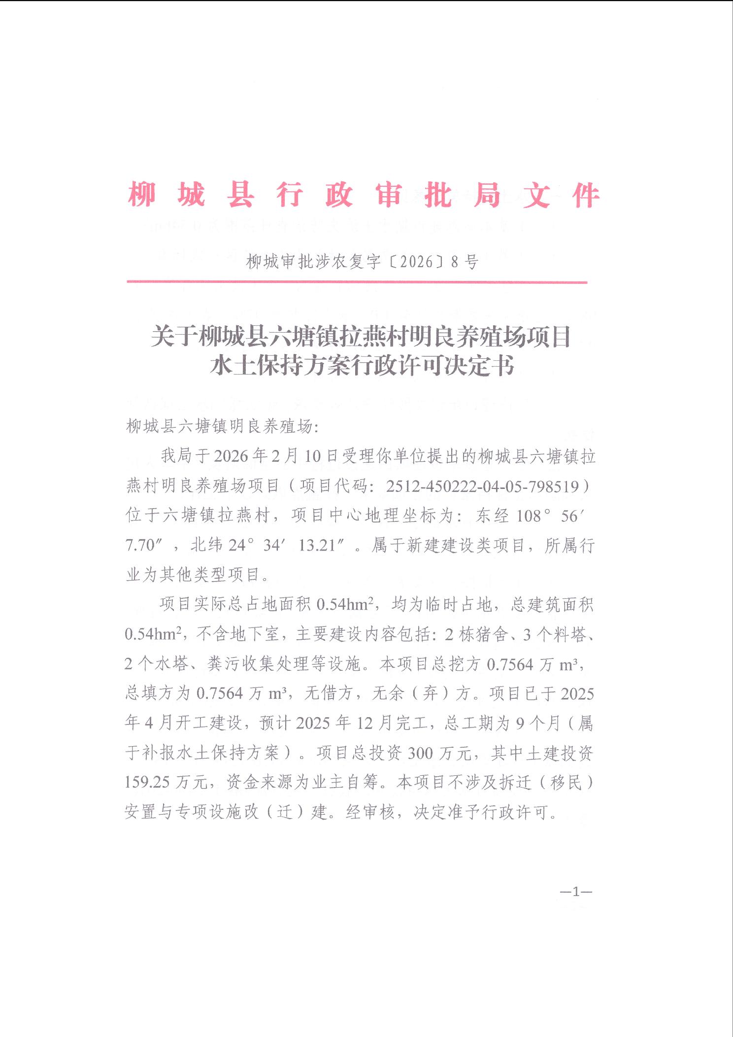 柳城縣六塘鎮(zhèn)拉燕村明良養(yǎng)殖場項(xiàng)目水土保持方案行政許可決定書