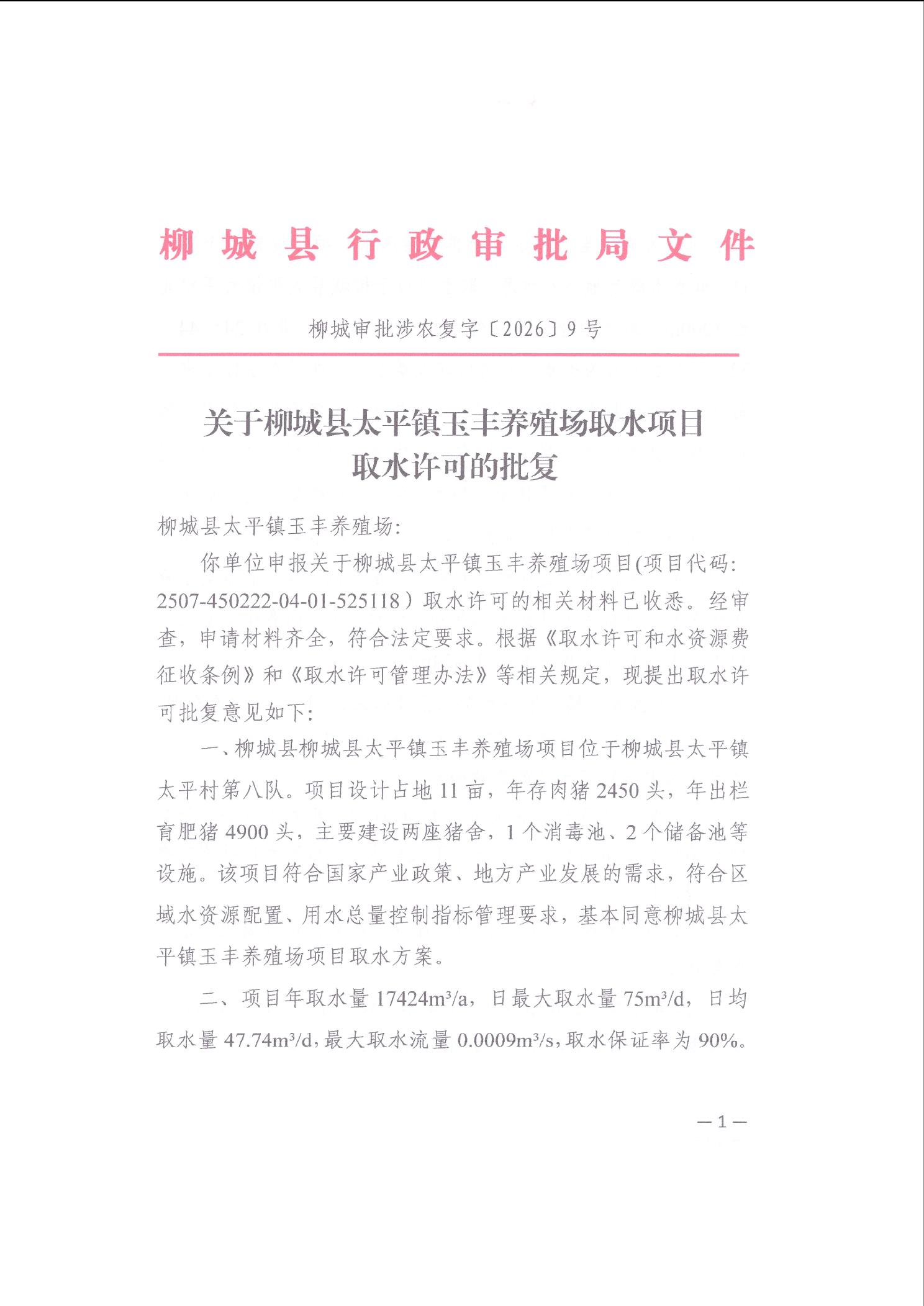 柳城縣行政審批局關(guān)于柳城縣太平鎮(zhèn)玉豐養(yǎng)殖場取水項目取水許可的批復(fù)