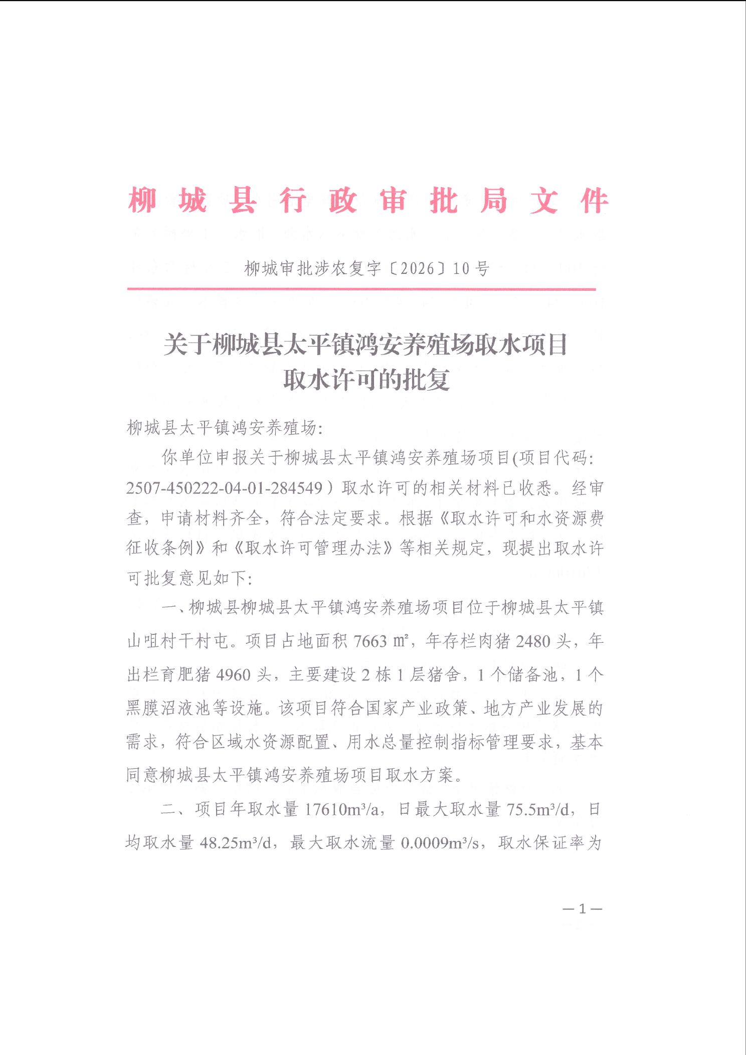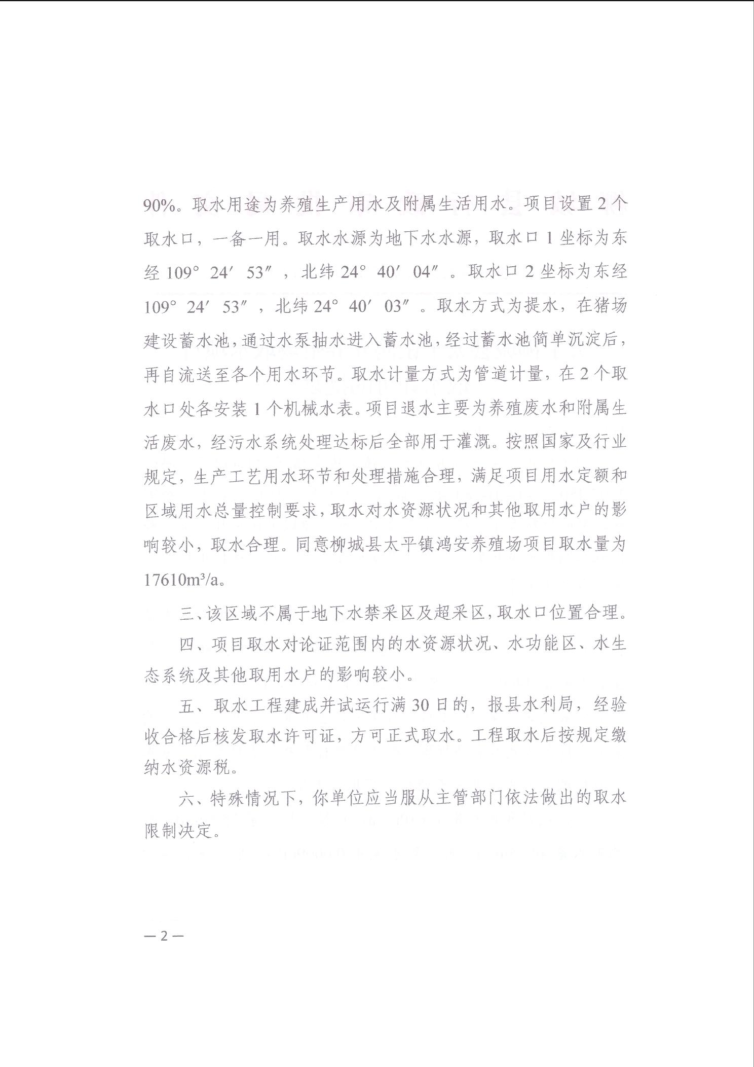 柳城縣行政審批局關(guān)于柳城縣太平鎮(zhèn)鴻安養(yǎng)殖場(chǎng)取水項(xiàng)目取水許可的批復(fù)