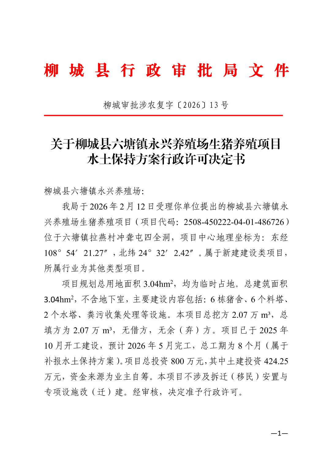 柳城縣六塘鎮(zhèn)永興養(yǎng)殖場生豬養(yǎng)殖項(xiàng)目水土保持方案行政許可決定書