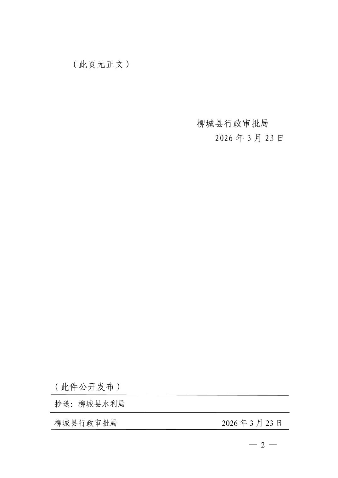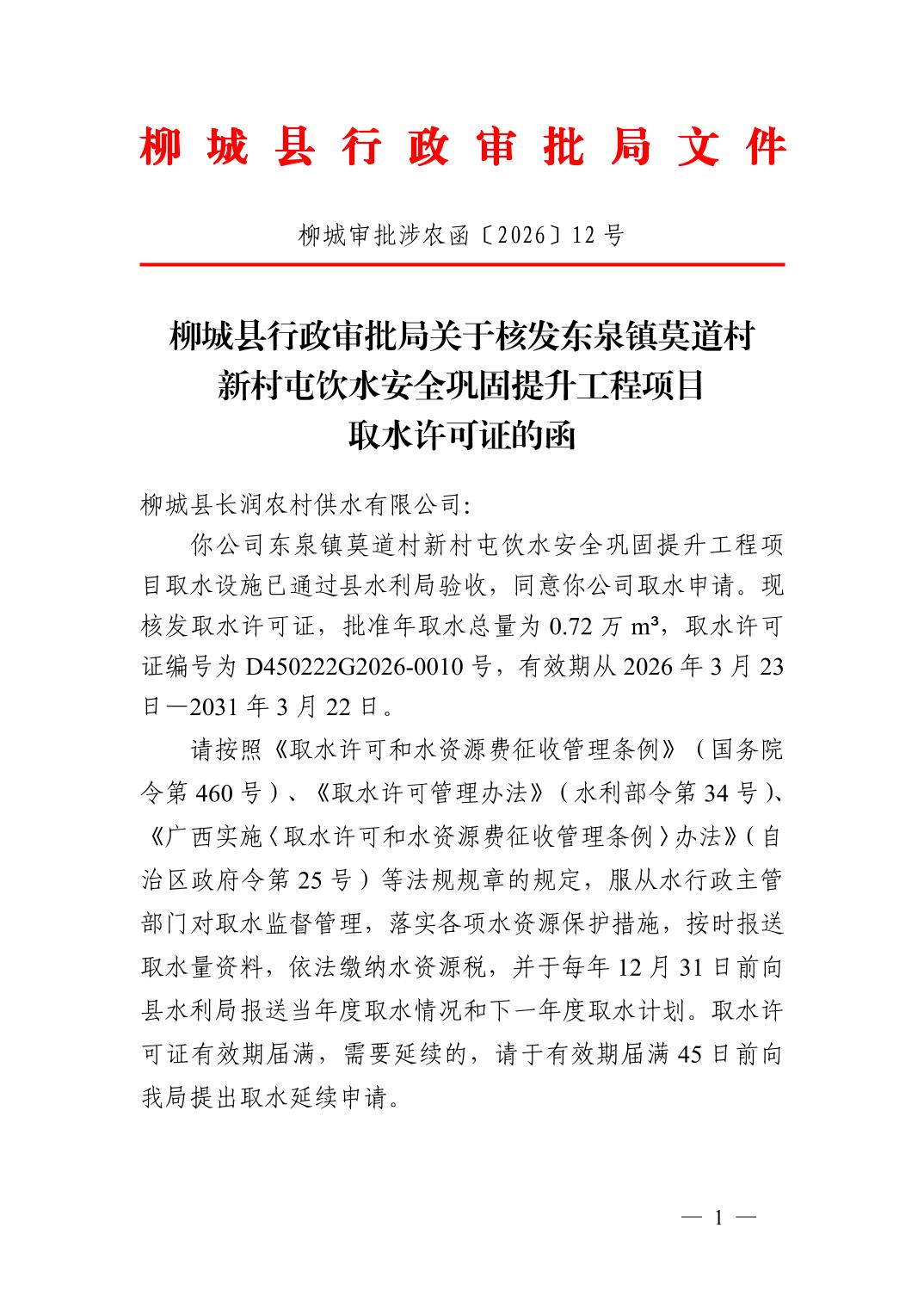 柳城縣行政審批局關(guān)于核發(fā)東泉鎮(zhèn)莫道村新村屯飲水安全鞏固提升工程項目取水許可證的函