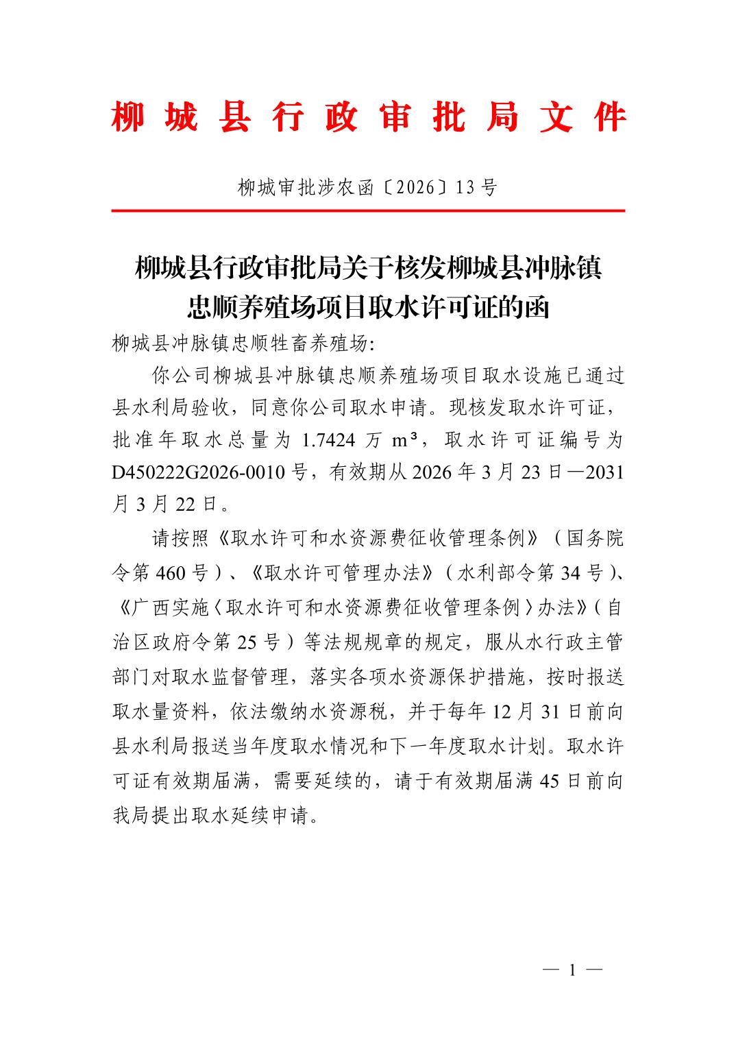 柳城縣行政審批局關(guān)于核發(fā)柳城縣沖脈鎮(zhèn)忠順牲畜養(yǎng)殖場(chǎng)取水許可證的函 -