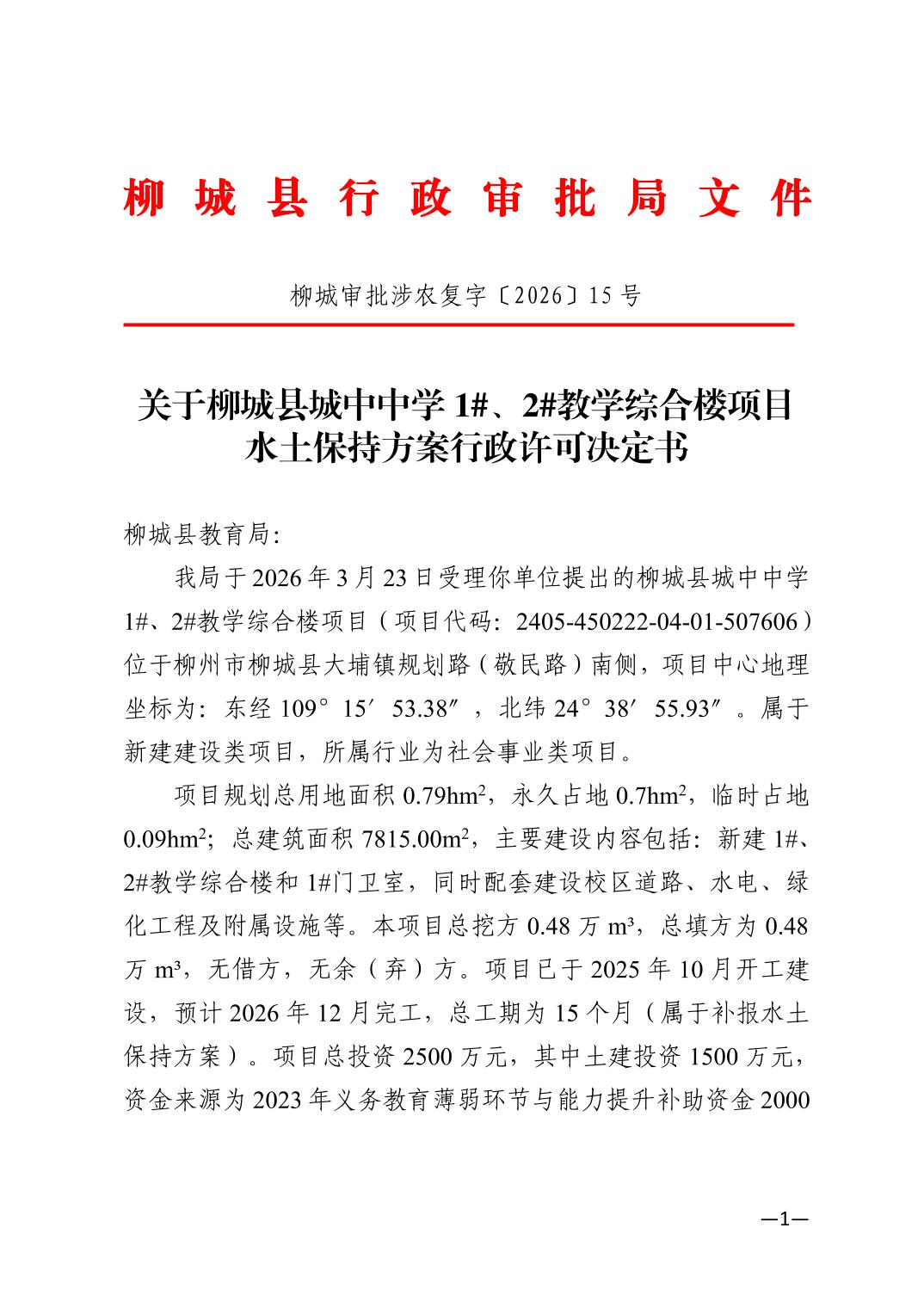 柳城縣城中中學1#、2#教學綜合樓項目水土保持方案行政許可決定書