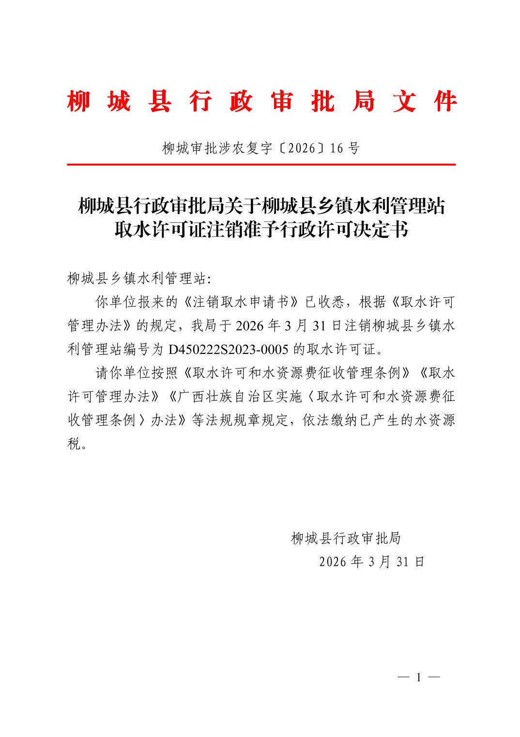 柳城縣行政審批局關(guān)于柳城縣鄉(xiāng)鎮(zhèn)水利管理站取水許可證注銷準(zhǔn)予行政許可決定書