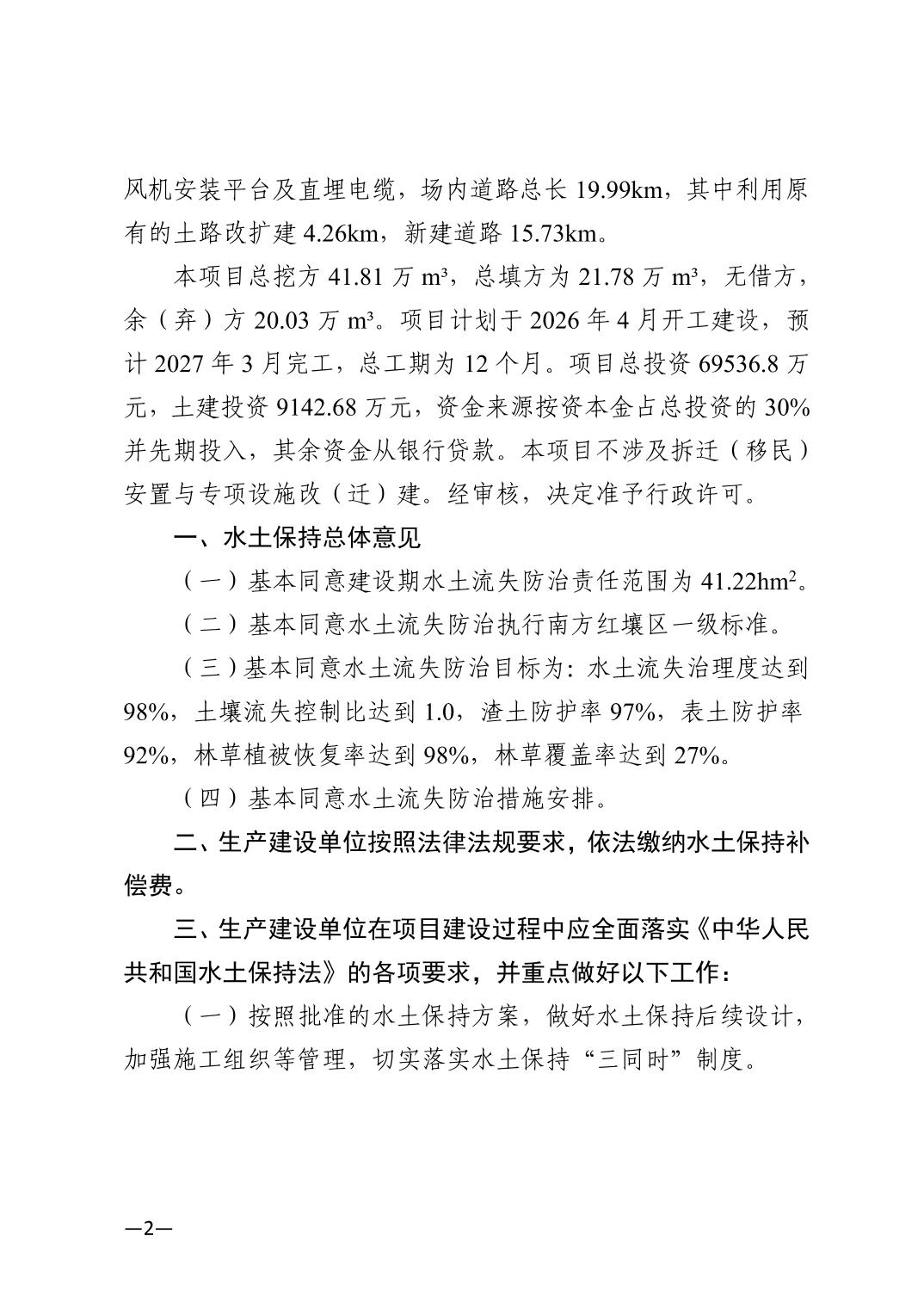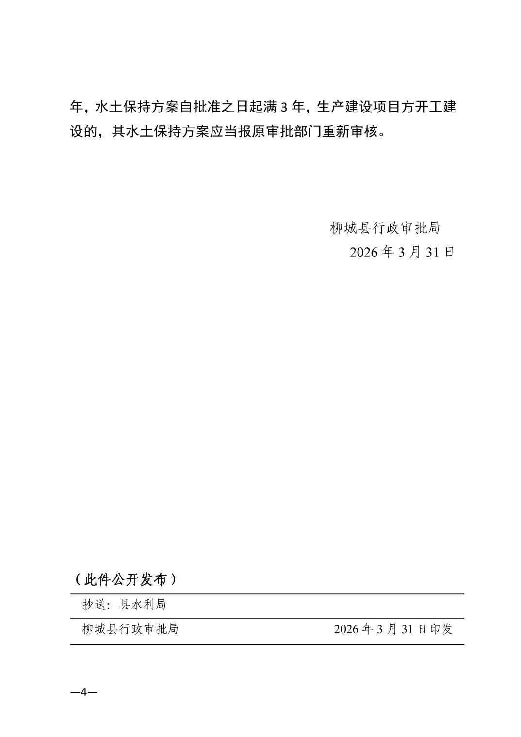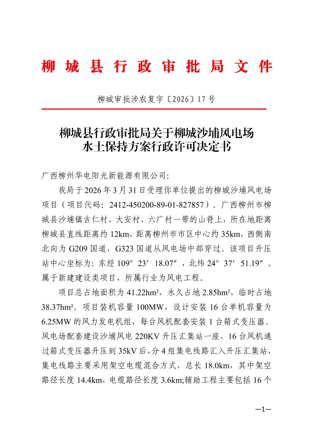 柳城縣行政審批局關(guān)于柳城沙埔風(fēng)電場水土保持方案行政許可決定書