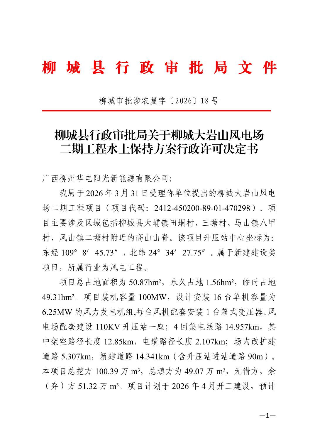 柳城縣行政審批局關于柳城大巖山風電場二期工程水土保持方案行政許可決定書