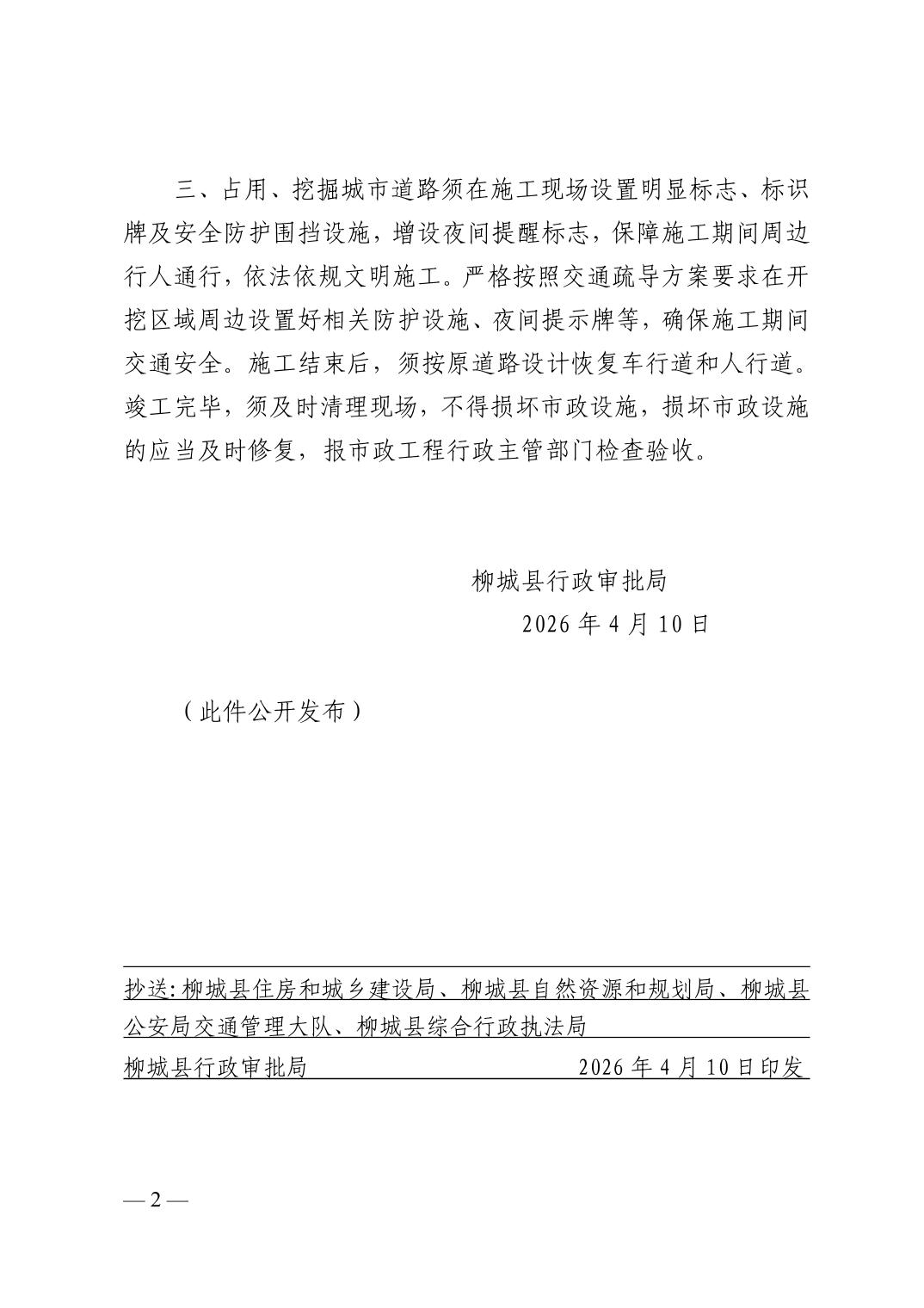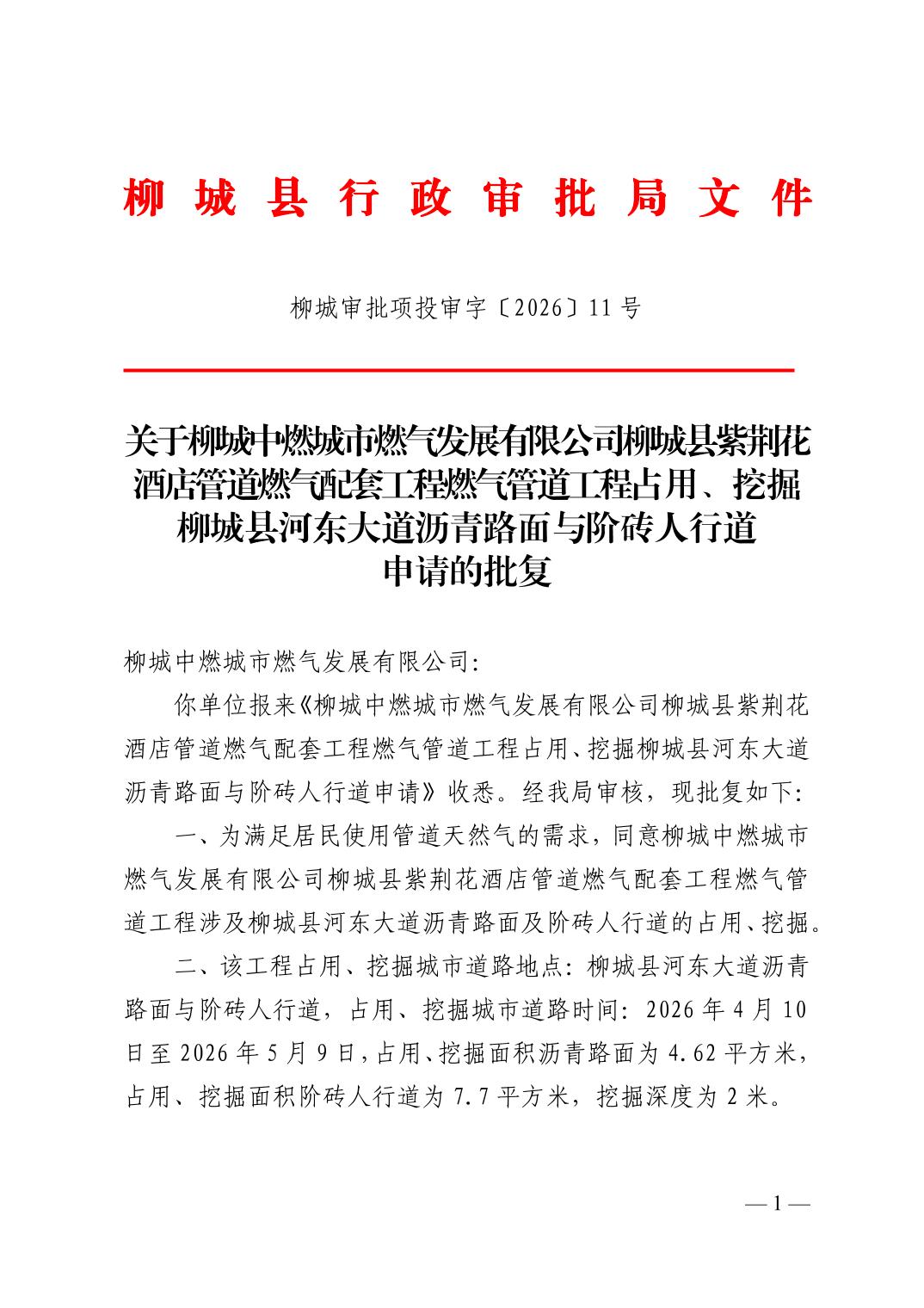 關(guān)于柳城中燃城市燃?xì)獍l(fā)展有限公司柳城縣紫荊花酒店管道燃?xì)馀涮坠こ倘細(xì)夤艿拦こ陶加?、挖掘柳城縣河?xùn)|大道瀝青路面與階磚人行道申請的批復(fù)