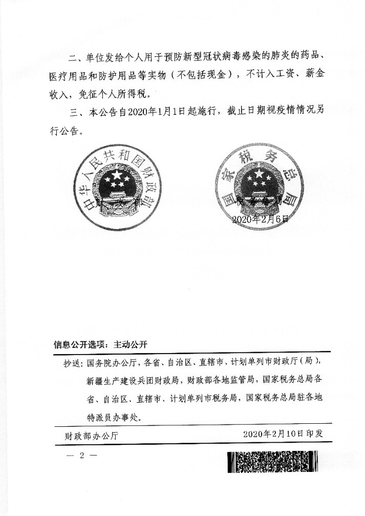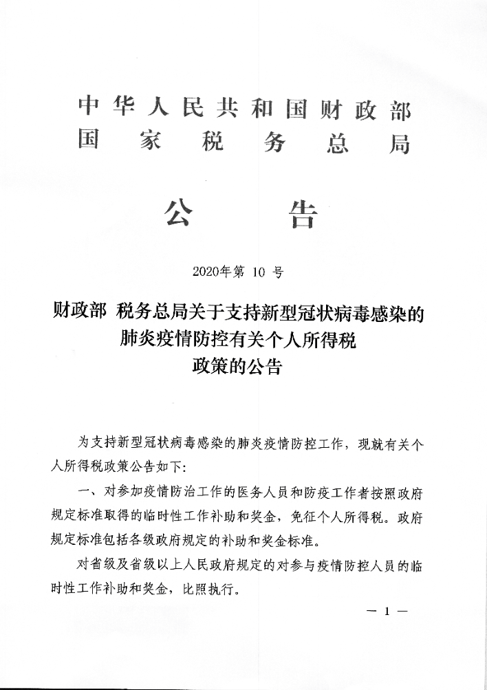 財(cái)政部 稅務(wù)總局關(guān)于支持新型冠狀病毒感染的肺炎疫情防控有關(guān)個(gè)人所得稅政策的公告