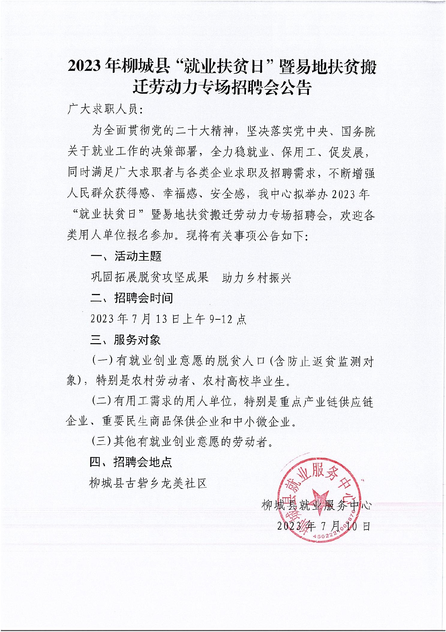 2023年柳城縣“就業(yè)扶貧日”暨易地扶貧搬遷勞動(dòng)力專場(chǎng)招聘會(huì)公告