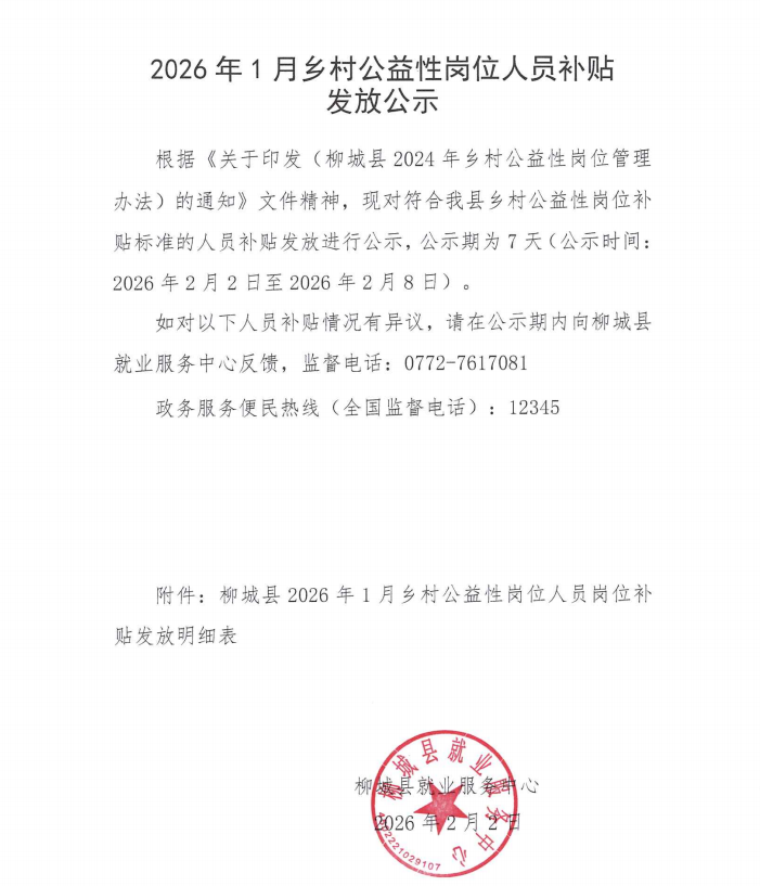 2026年1月鄉(xiāng)村公益性崗位人員崗位補(bǔ)貼發(fā)放公示