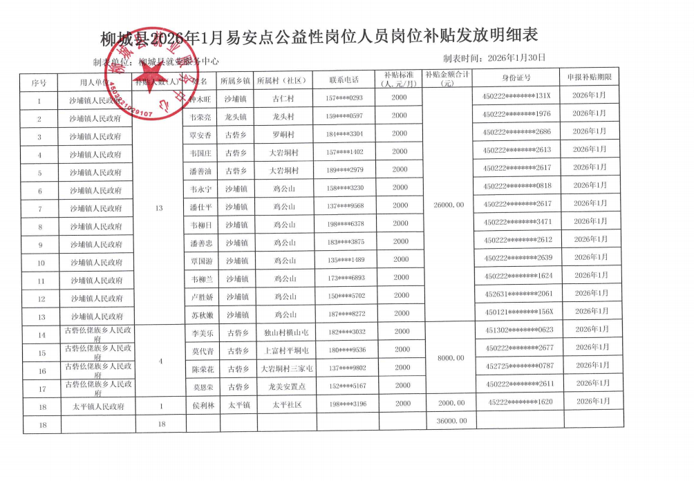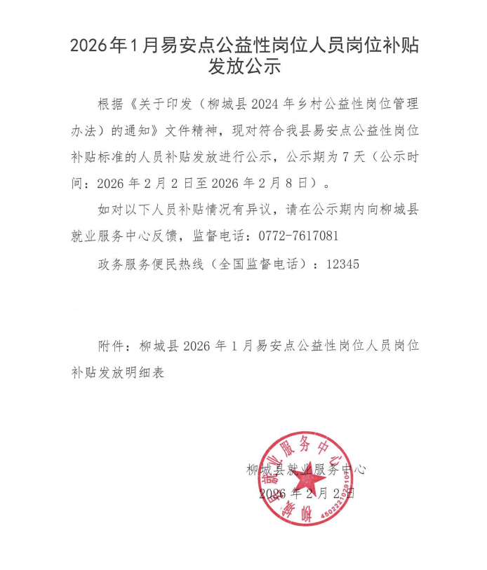 2026年1月易安點公益性崗位人員崗位補貼發(fā)放公示