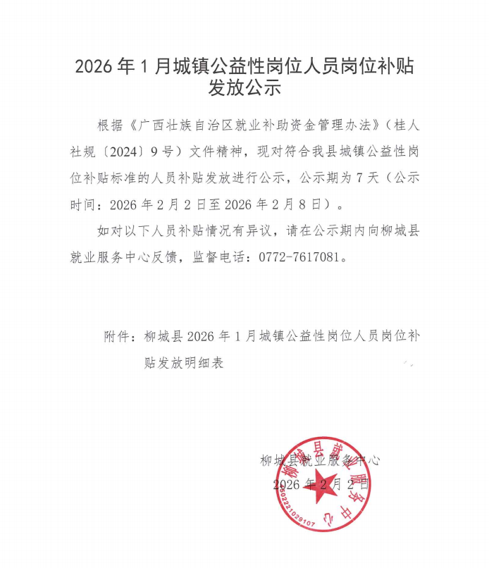 2026年1月城鎮(zhèn)公益性崗位人員崗位補(bǔ)貼發(fā)放公示