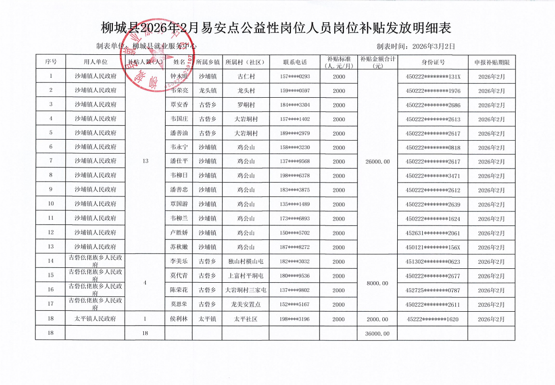 2026年2月易安點(diǎn)公益性崗位人員崗位補(bǔ)貼發(fā)放公示