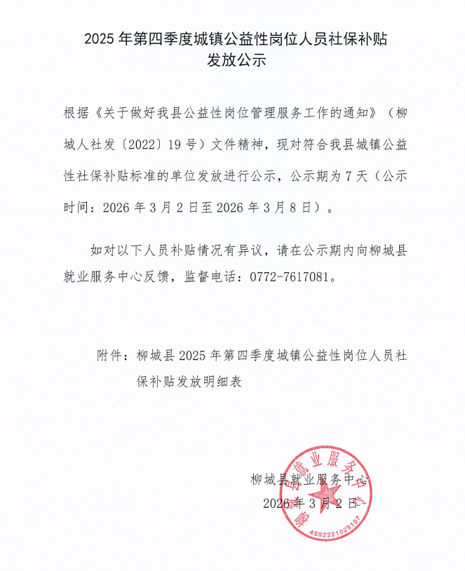 2025年第四季度城鎮(zhèn)公益性崗位人員社保補(bǔ)貼發(fā)放公示