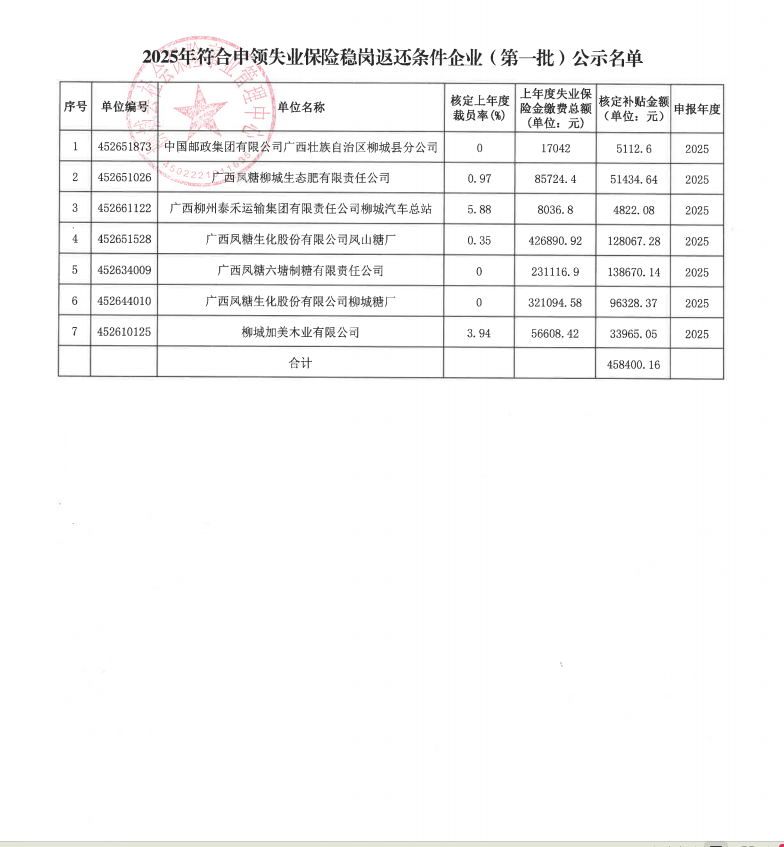為更好地發(fā)揮失業(yè)保險預防失業(yè)、促進就業(yè)作用,激勵企業(yè)承擔穩(wěn)定就業(yè)的社會責任,根據(jù)《廣西壯族自治區(qū)人力資源和社會保障廳 廣西壯族自治區(qū)財政廳 國家稅務總局廣西壯族自治區(qū)稅務局關于延續(xù)實施失業(yè)保險穩(wěn)崗惠民政策措施的通知》(桂人社發(fā)〔2025〕19號)等規(guī)定,經(jīng)審核,現(xiàn)對符合申領失業(yè)保險穩(wěn)崗返還條件的7家企業(yè)名單(詳見附件)予以公示。公示期為7天,即從2025年9月19日至2025年9月25日。請企業(yè)將穩(wěn)崗返還資金用于職工生活補助、繳納社會保險費、轉(zhuǎn)崗培訓、技能提升培訓等穩(wěn)定就業(yè)崗位以及降低生產(chǎn)經(jīng)營成本支出。