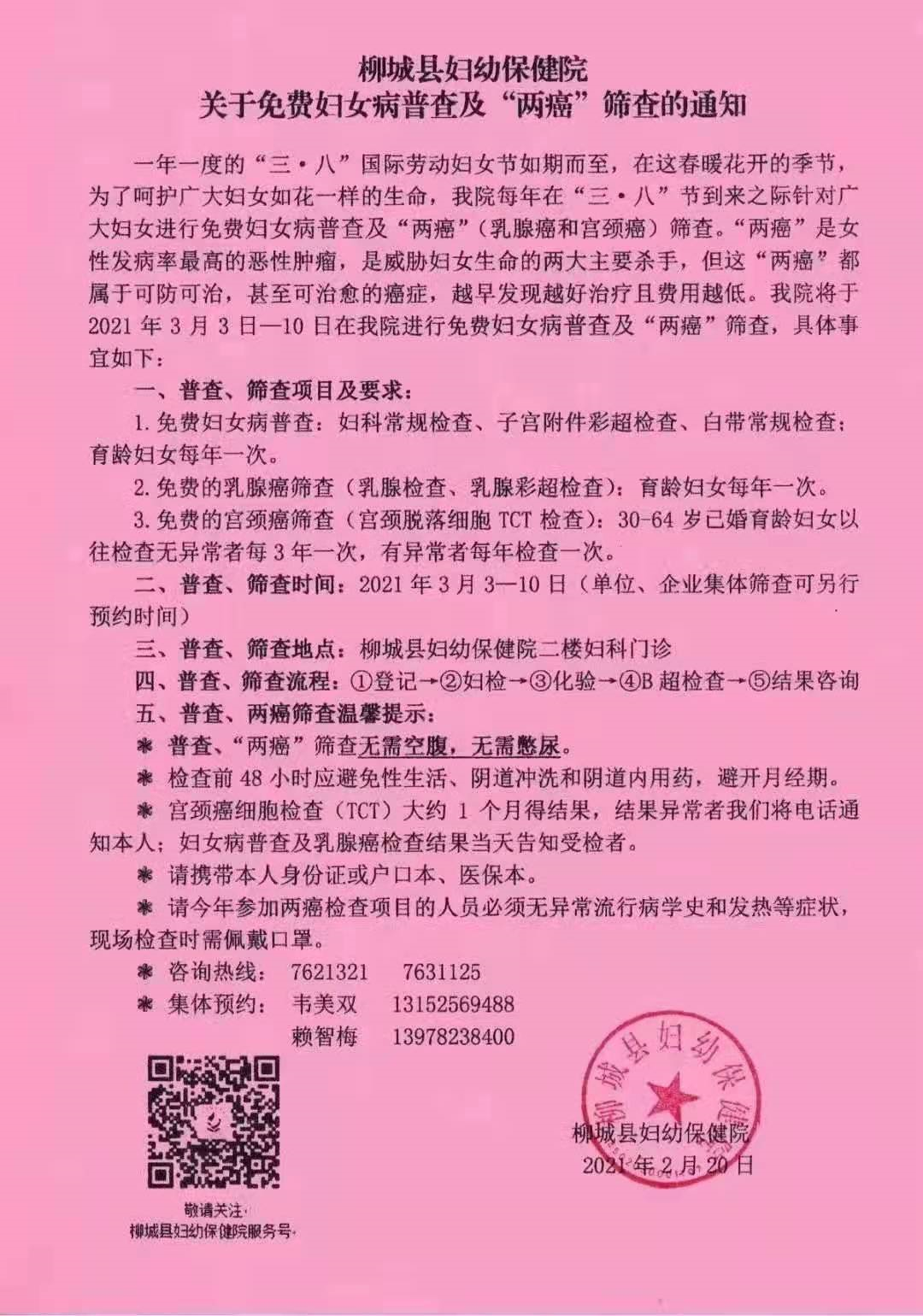 柳城縣婦幼保健院關(guān)于免費(fèi)婦女病普查及“兩癌“篩查的通知