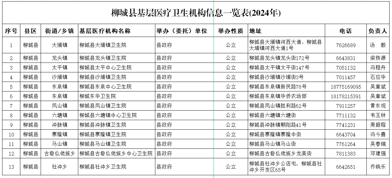 柳城縣基層醫(yī)療衛(wèi)生機(jī)構(gòu)信息一覽表(2024年)