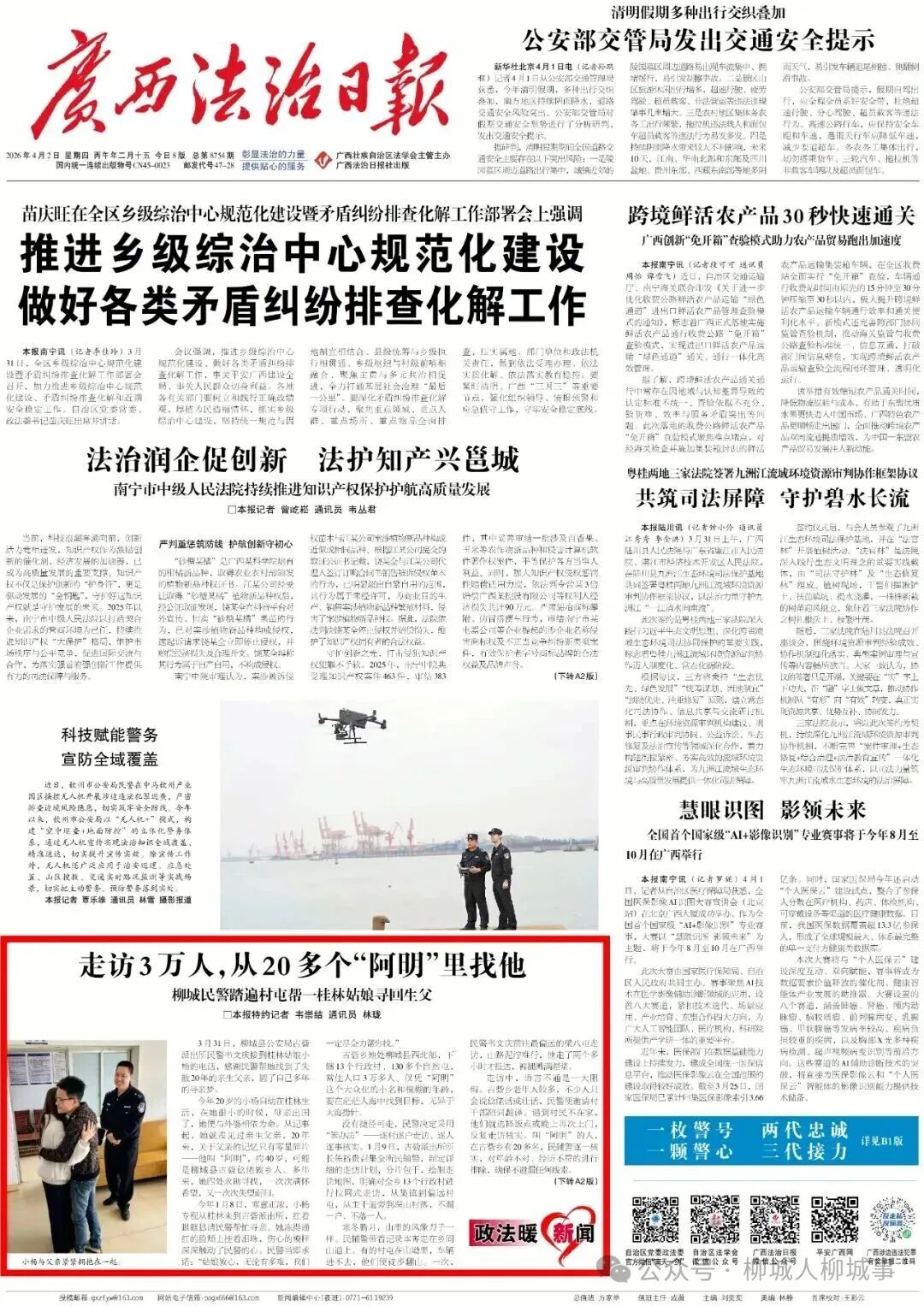 4月2日,《廣西法治日報》頭版刊發(fā)《走訪3萬人,從20多個“阿明”里找他——柳城民警踏遍村屯幫一桂林姑娘尋回生父》一文,講述了一段跨越20載的尋親團圓故事。