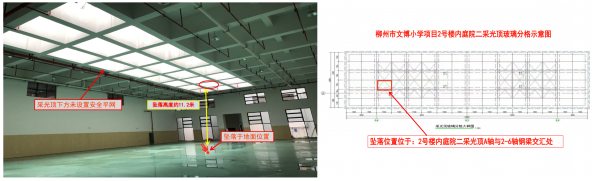 采光頂南北方向?qū)惭b6塊玻璃,東西方向?qū)惭b16塊玻璃,采光頂屋面共計(jì)安裝96塊玻璃。陳某平墜落位置位于2#樓第二層內(nèi)庭院二采光頂A軸與2-6軸鋼梁交匯處,距離地下室地面高度約11.2米,采光頂作業(yè)面下未設(shè)置安全平網(wǎng)。(見(jiàn)圖2)