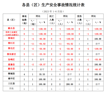 1-6月份事故下降列入紅榜的縣(區(qū))有:融水縣、陽和工業(yè)新區(qū)(北部生態(tài)新區(qū))2個縣(區(qū))事故起數(shù)均為0,柳江區(qū)(事故減少11起、死亡減少11人)、柳南區(qū)(事故減少4起、死亡減少5人)、柳北區(qū)(事故減少2起、死亡減少2人)、鹿寨縣(事故減少2起、死亡減少2人)、柳東新區(qū)(事故減少1起、死亡減少2人)、融安縣(死亡減少1人)、魚峰區(qū)(死亡減少1人)。