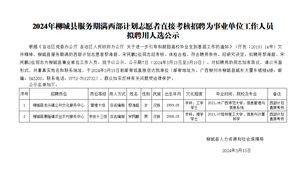 2024年柳城縣服務(wù)期滿西部計(jì)劃志愿者直接考核招聘為事業(yè)單位工作人員擬聘人員公示