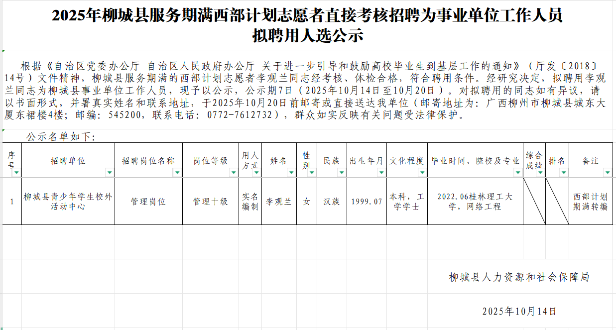 2025年柳城縣服務期滿西部計劃志愿者直接考核招聘為事業(yè)單位工作人員擬聘用人選公示