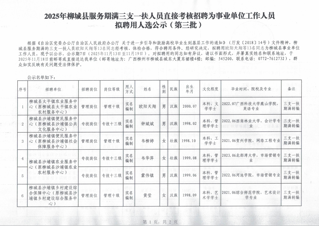 2025年柳城縣服務(wù)期滿三支一扶人員直接考核招聘為事業(yè)單位工作人員擬聘人員公示(第三批)