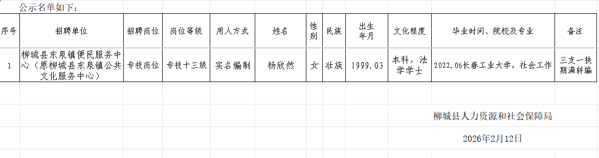 根據(jù)《自治區(qū)黨委辦公廳自治區(qū)人民政府辦公廳 關于進一步引導和鼓勵高校畢業(yè)生到基層工作的通知》(廳發(fā)〔2018〕14號)文件精神,柳城縣服務期滿的三支一扶人員楊欣然同志經考核、體檢合格,符合聘用條件。經研究決定,擬聘用楊欣然同志為柳城縣事業(yè)單位工作人員,現(xiàn)予以公示,公示期7日(2026年2月12日至2月18日)。對擬聘用的同志如有異議,請以書面形式,并署真實姓名和聯(lián)系地址,于2026年2月18日前郵寄或直接送達我單位(郵寄地址為:廣西柳州市柳城縣城東大廈東裙樓4樓;郵編:545200,聯(lián)系電話:0772-7612732),群眾如實反映有關問題受法律保護。