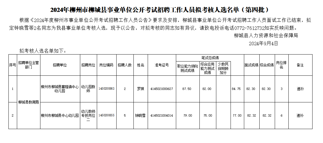 2024年柳州市事業(yè)單位公開考試招聘工作人員擬考核人選名單 (遞補(bǔ)人員)(第四批)