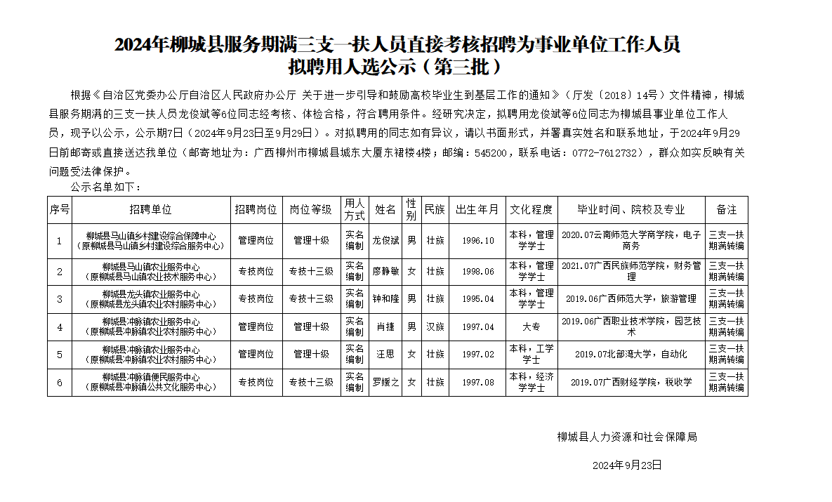 2024年柳城縣服務(wù)期滿三支一扶人員直接考核招聘為事業(yè)單位工作人員擬聘人員公示(第三批)