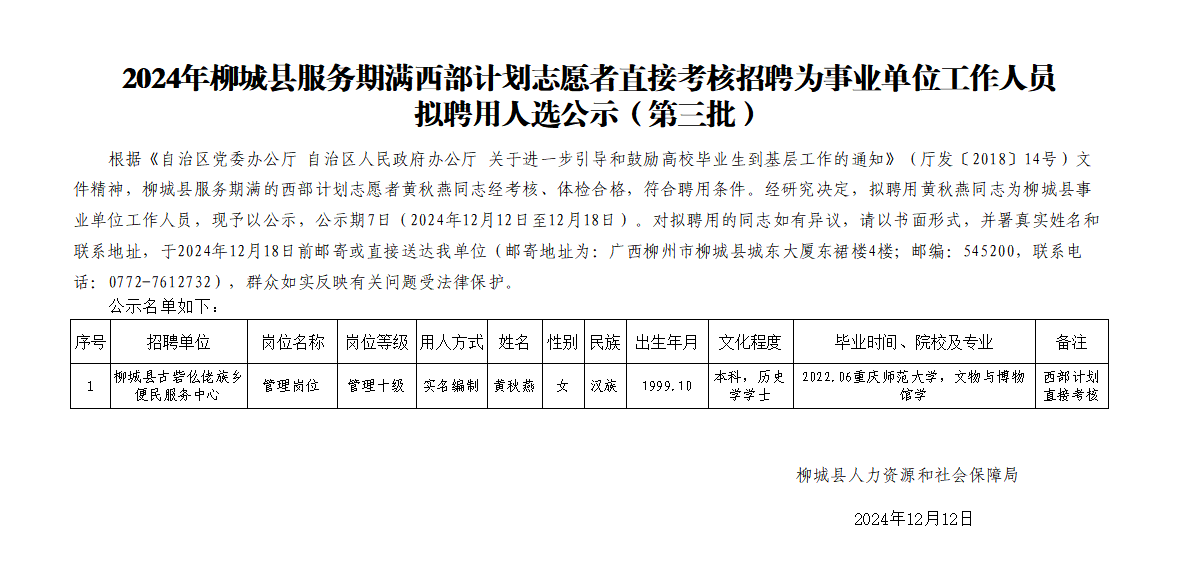2024年柳城縣服務(wù)期滿西部計(jì)劃志愿者直接考核招聘為事業(yè)單位工作人員擬聘人員公示(第三批)