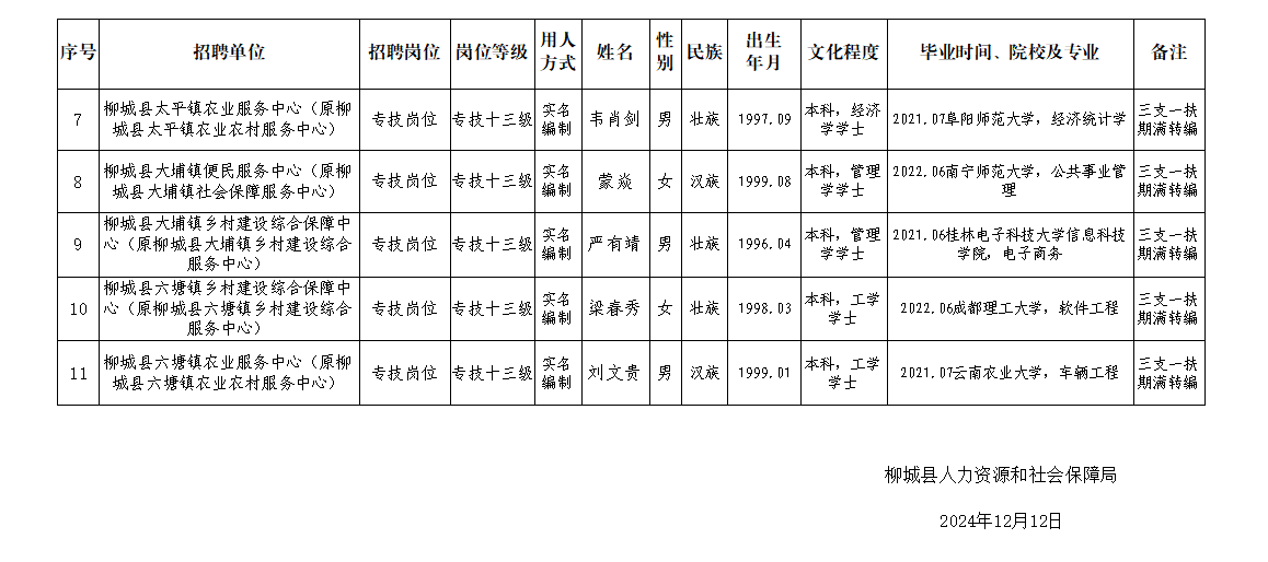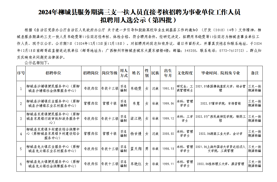 2024年柳城縣服務期滿三支一扶人員直接考核招聘為事業(yè)單位工作人員擬聘用人選公示(第四批)