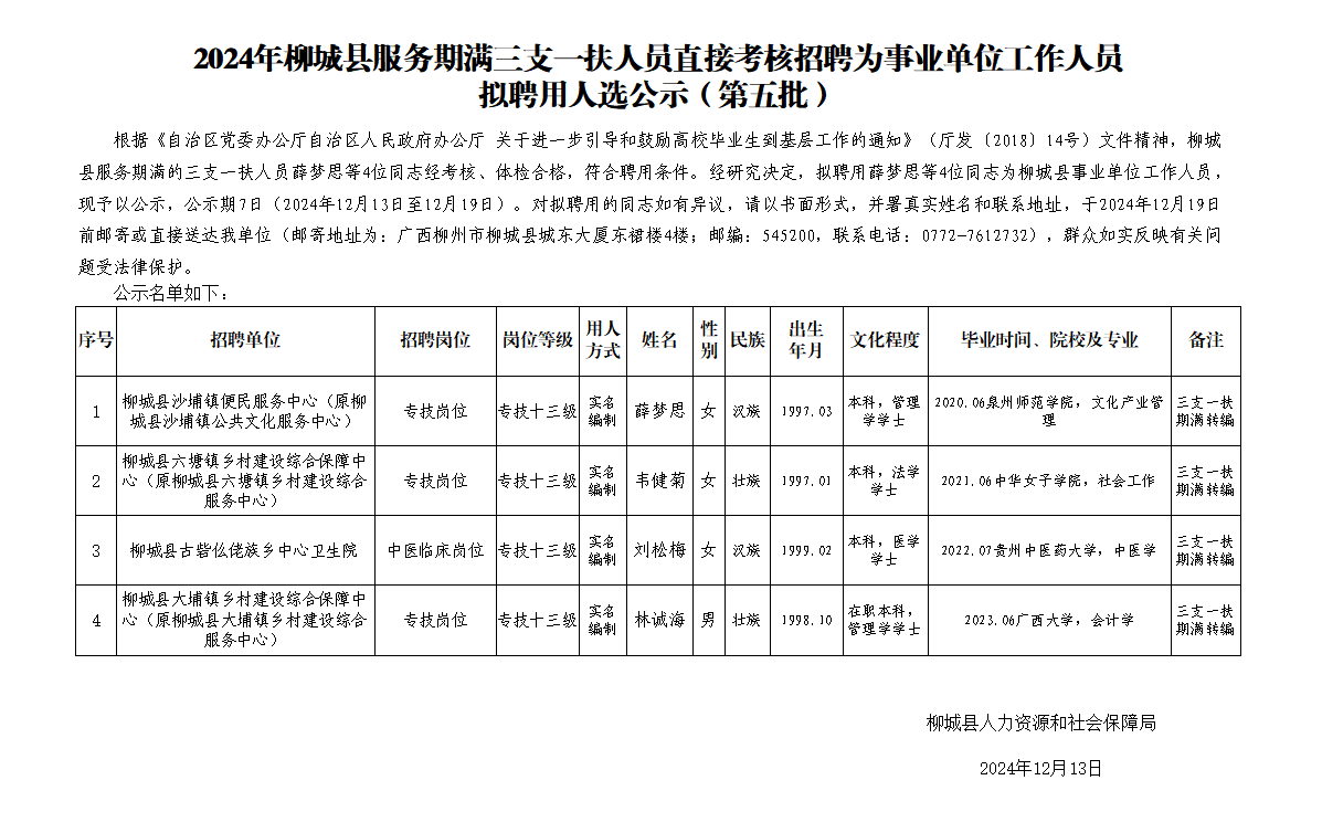2024年柳城縣服務(wù)期滿三支一扶人員直接考核招聘為事業(yè)單位工作人員 擬聘用人選公示(第五批)