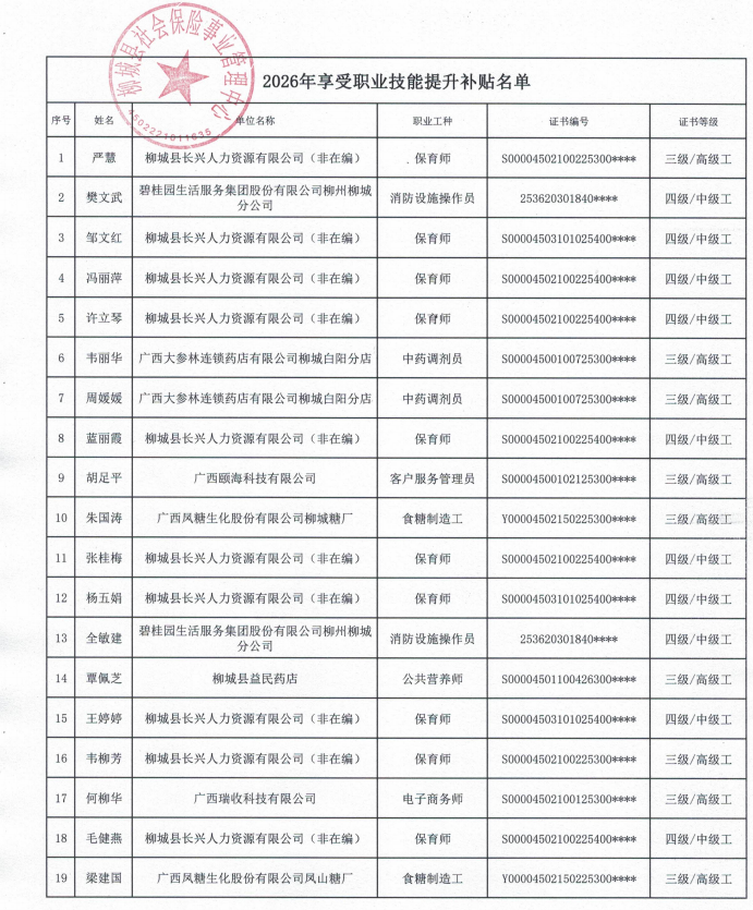 按照《廣西壯族自治區(qū)人力資源和社會(huì)保障廳財(cái)政廳關(guān)于印發(fā)失業(yè)保險(xiǎn)支持參保職工提升職業(yè)技能補(bǔ)貼暫行辦法的通知》(桂人社發(fā)〔2017〕44號(hào))文件精神,經(jīng)個(gè)人申報(bào),我中心審核,以下人員符合失業(yè)保險(xiǎn)支持參保職工提升職業(yè)技能補(bǔ)貼發(fā)放條件,現(xiàn)予公示,公示期為7天,即從2026年1月13日至2026年1月19日,公示期間,如有異議,請與柳城縣社會(huì)保險(xiǎn)事業(yè)管理中心聯(lián)系,聯(lián)系電話:0772-7614291。