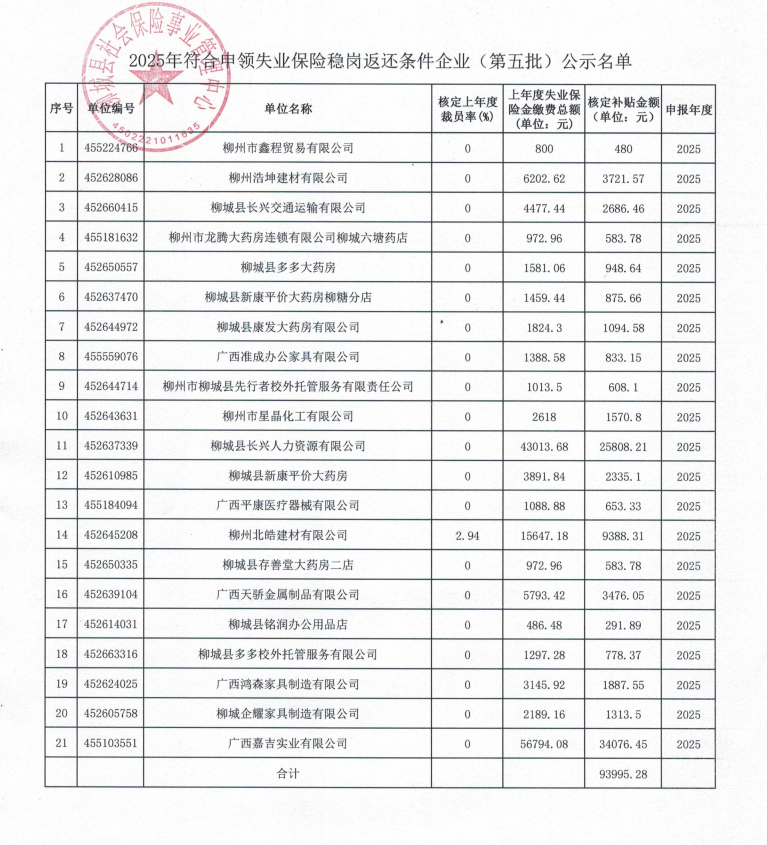 關(guān)于符合申領(lǐng)失業(yè)保險(xiǎn)穩(wěn)崗返還條件企業(yè)名單的公示(2025年第五批)