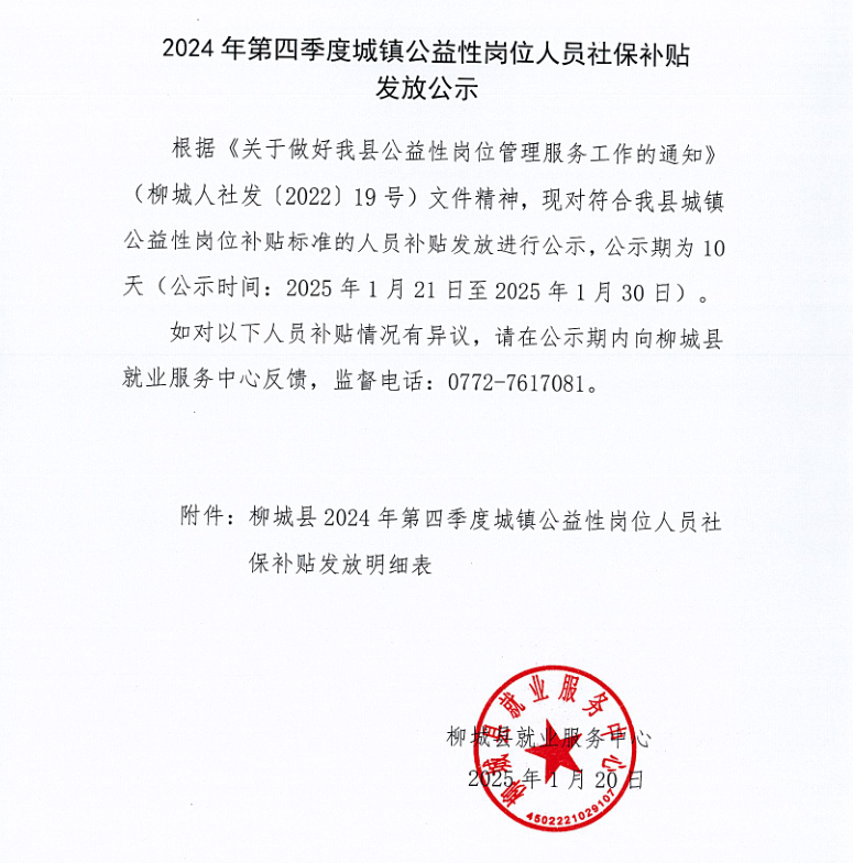 2024年第四季度城鎮(zhèn)公益性崗位人員社保補貼發(fā)放公示