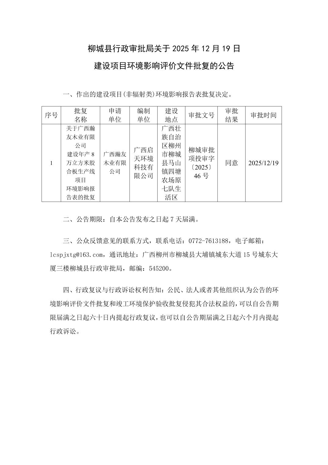 柳城縣行政審批局關于2025年12月19日建設項目環(huán)境影響評價文件批復的公告