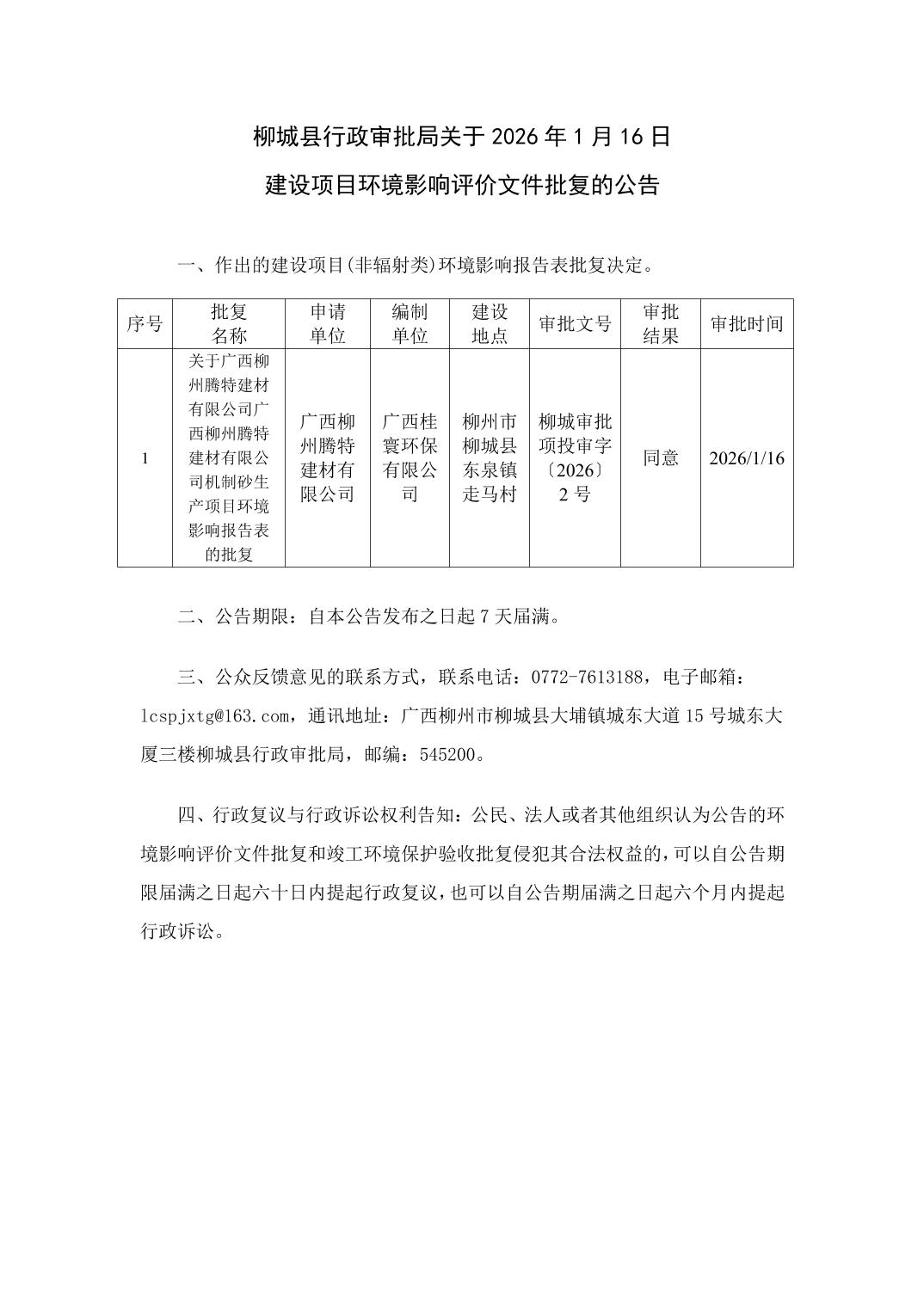 〔2026〕2號(hào)-關(guān)于廣西柳州騰特建材有限公司廣西柳州騰特建材有限公司機(jī)制砂生產(chǎn)項(xiàng)目環(huán)境影響報(bào)告表的批復(fù).docx