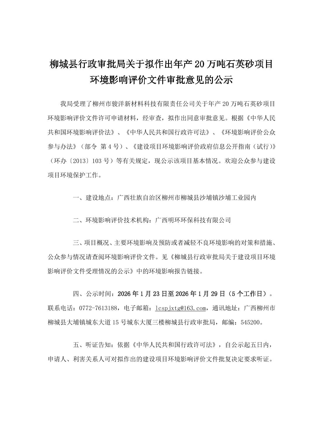 柳城縣行政審批局關(guān)于擬作出年產(chǎn)20萬噸石英砂項目環(huán)境影響評價文件審批意見的公示